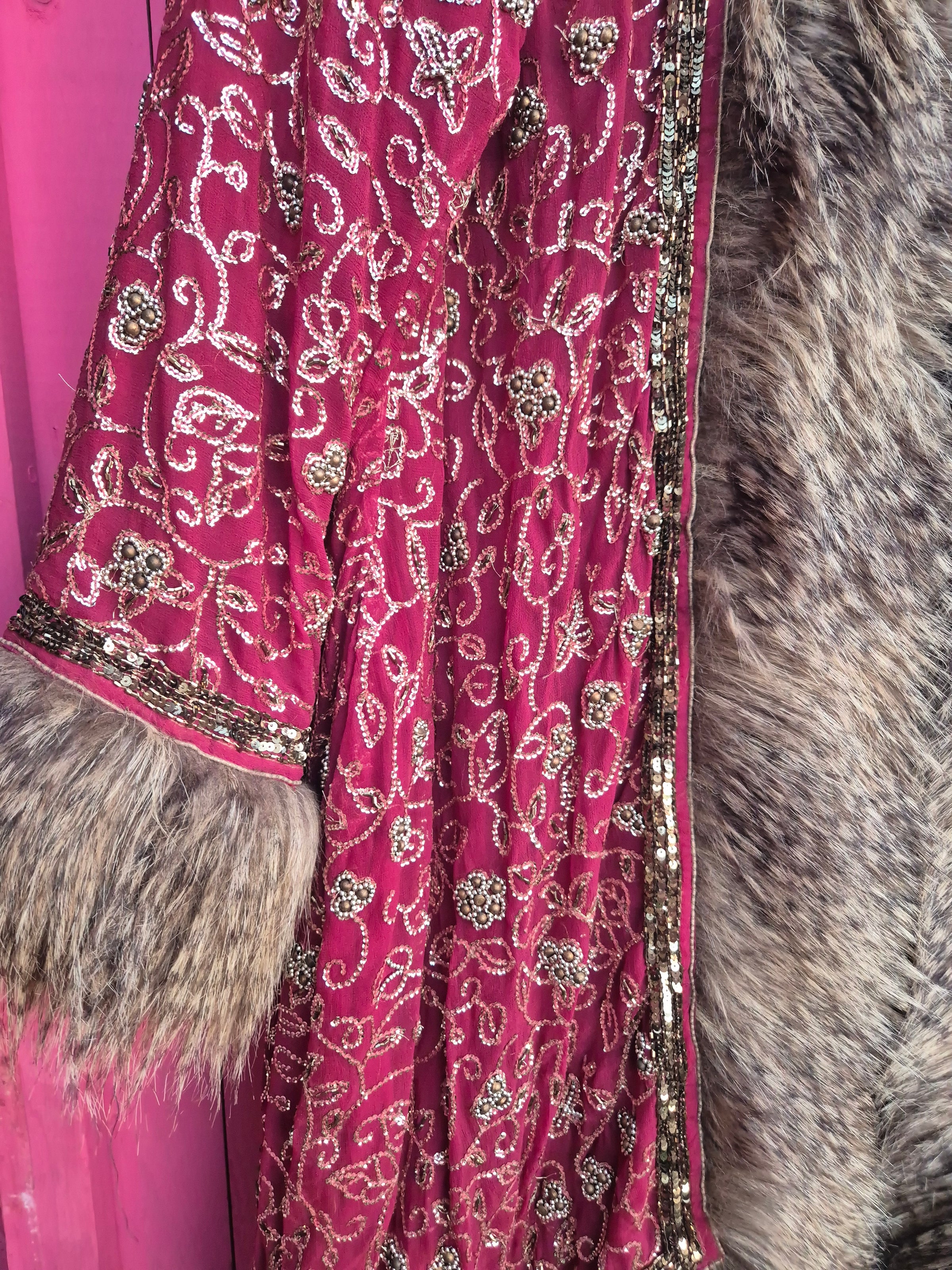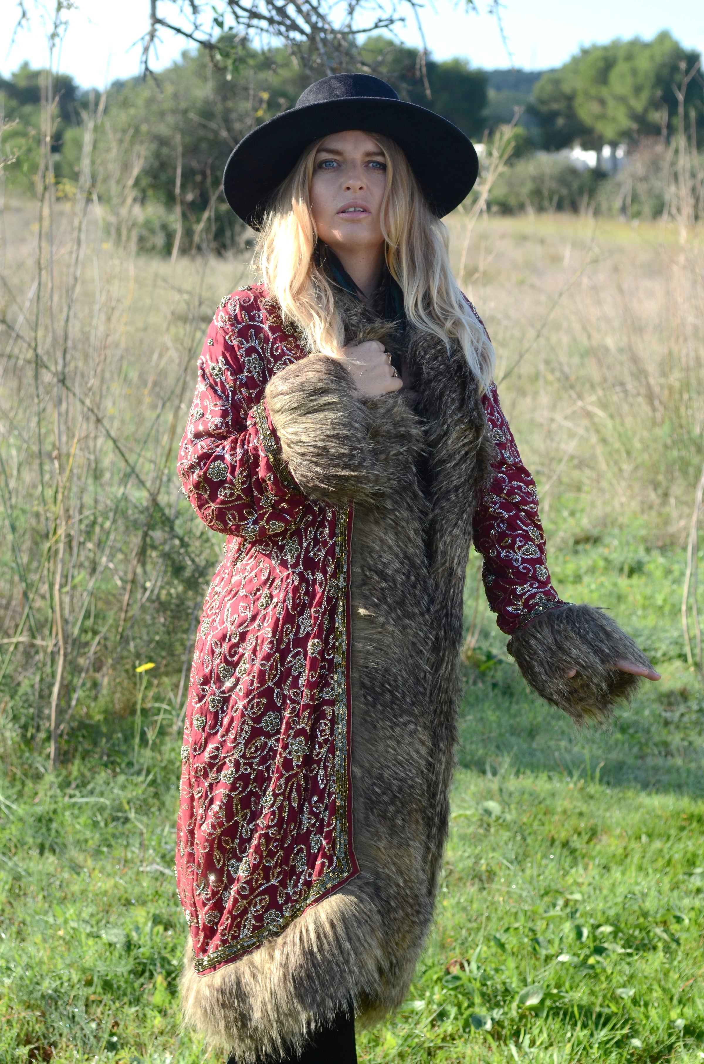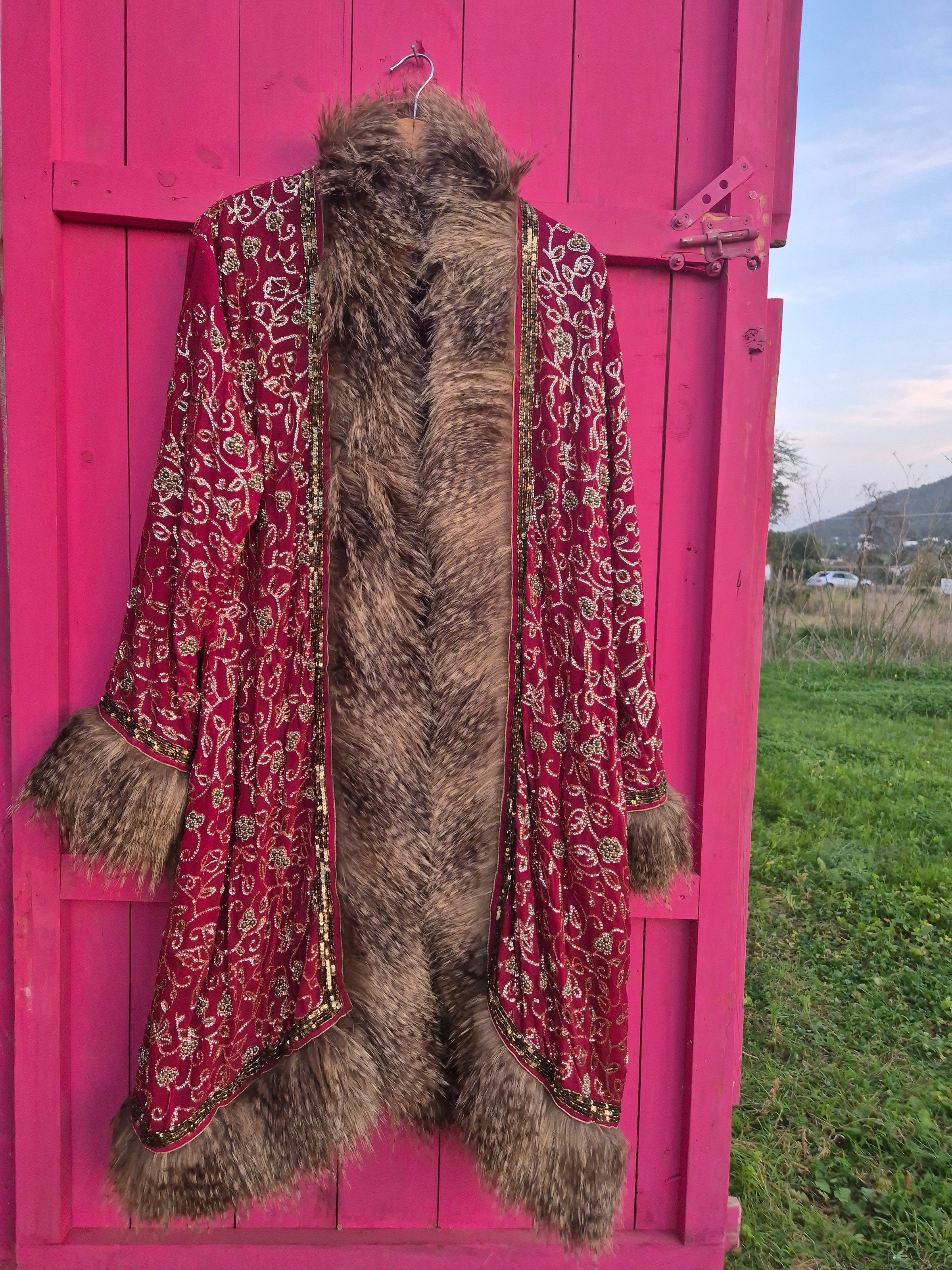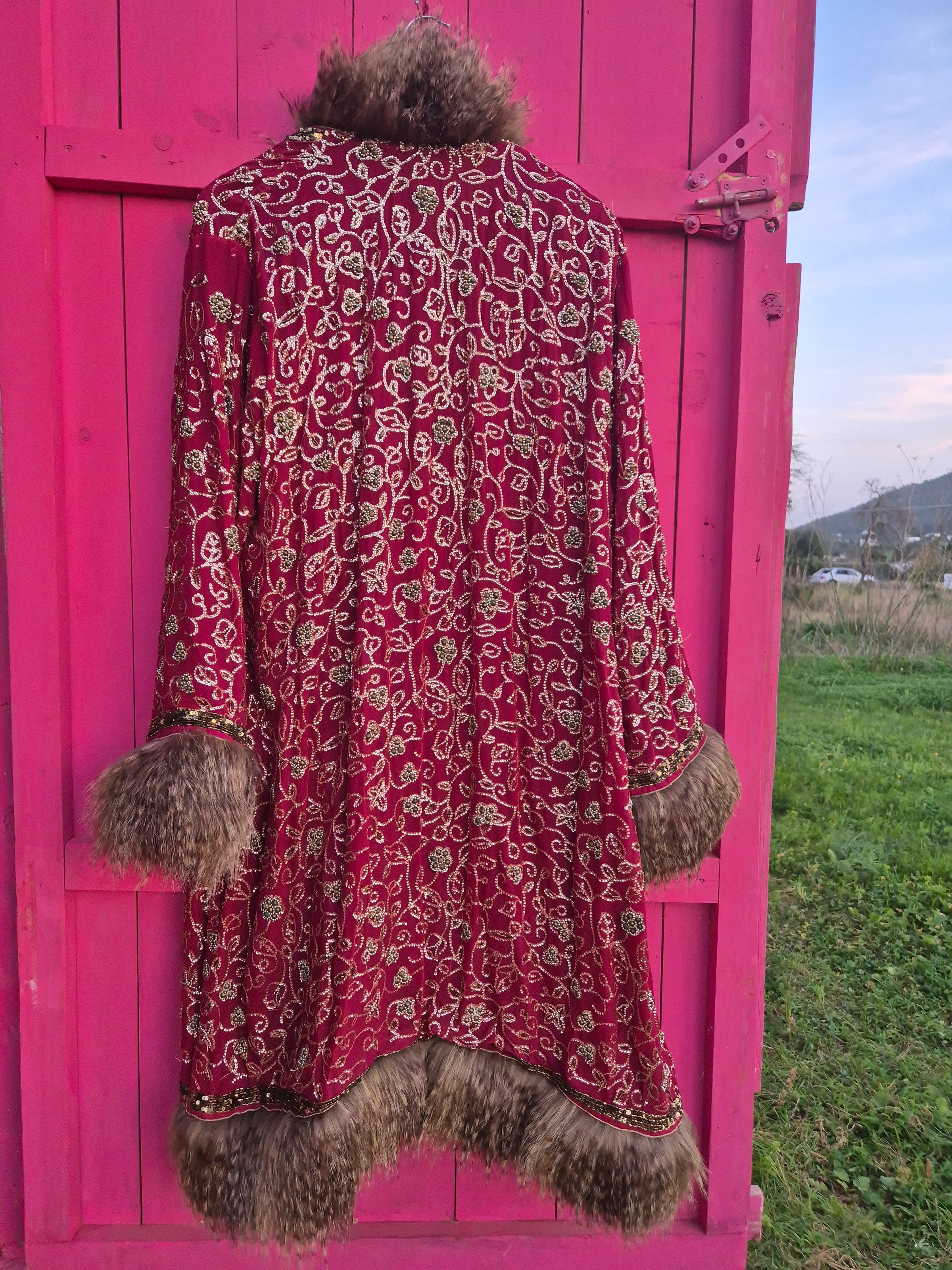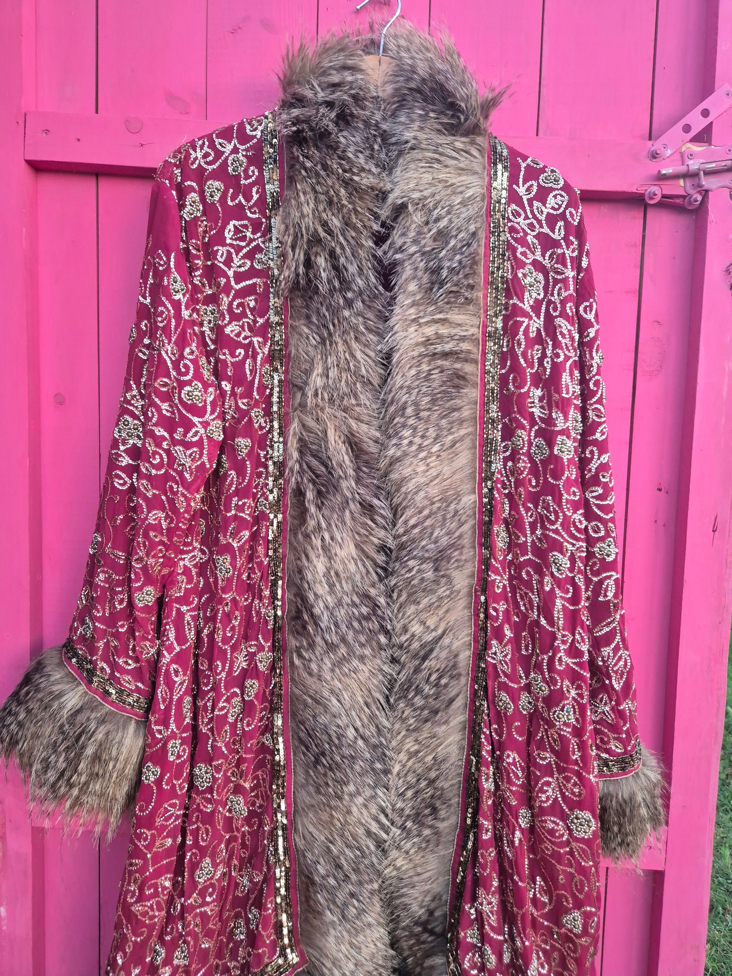 This coat is handmade with love. The coat is made of a vintage saree* and lined with cotton. It has pockets and is finished with non-natural fur. Because it's made of a vintage fabric, you won't find the same piece somewhere else.