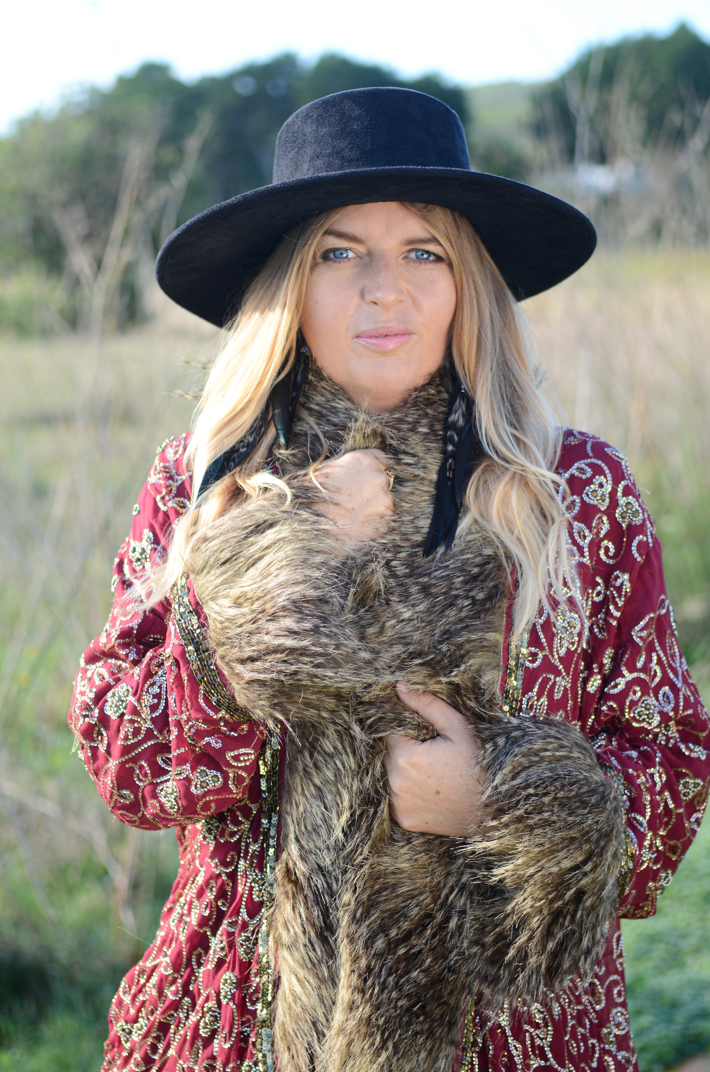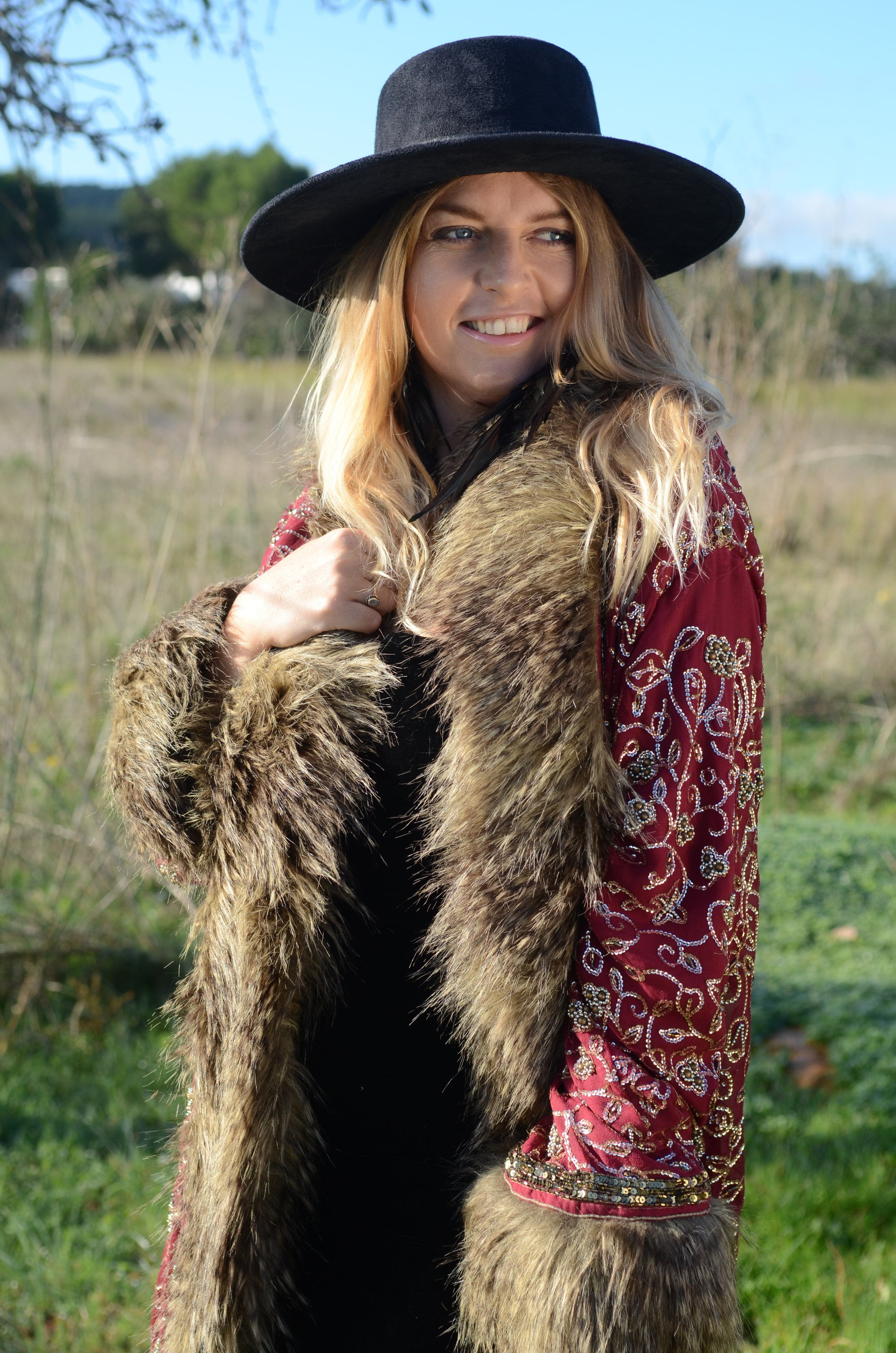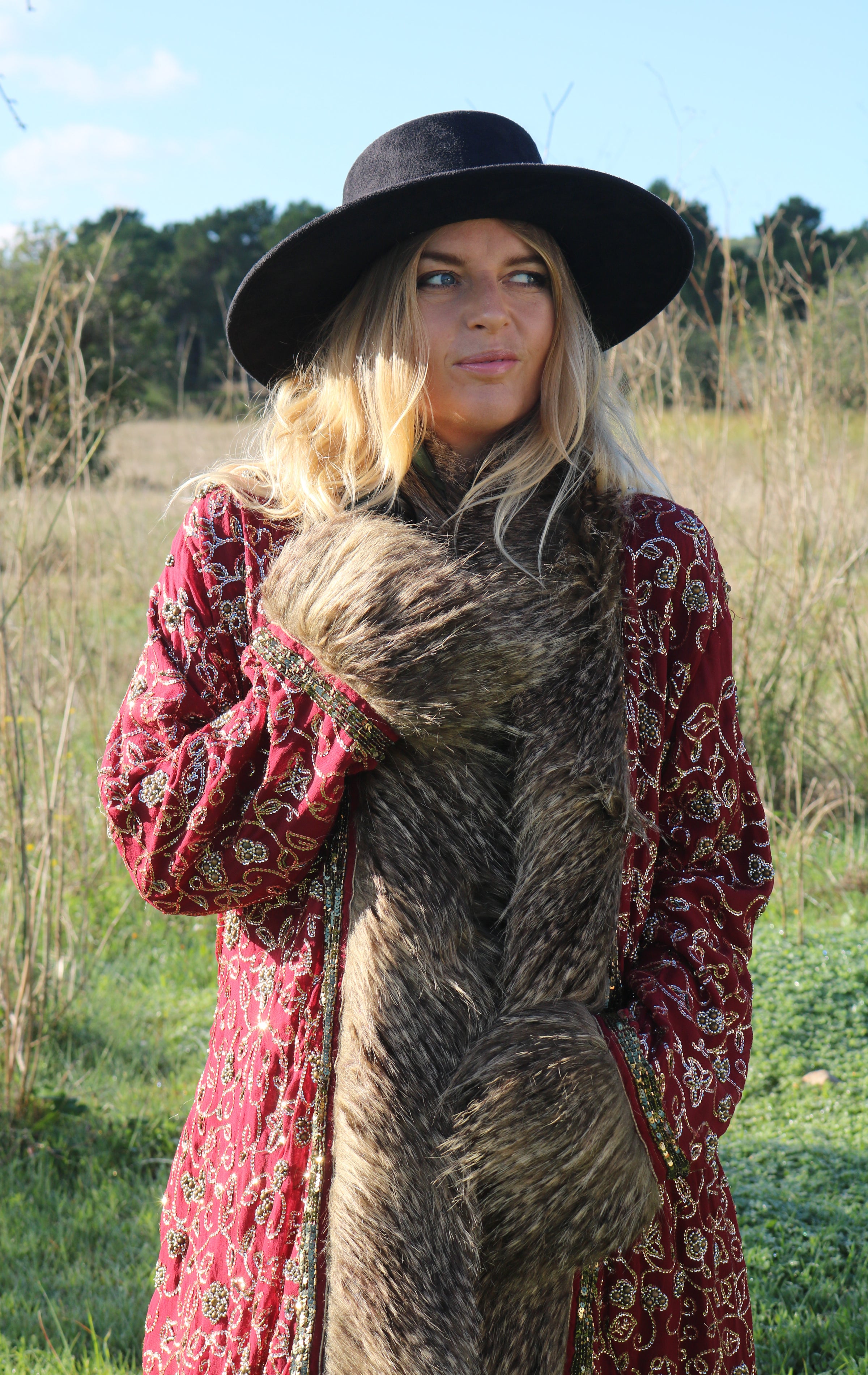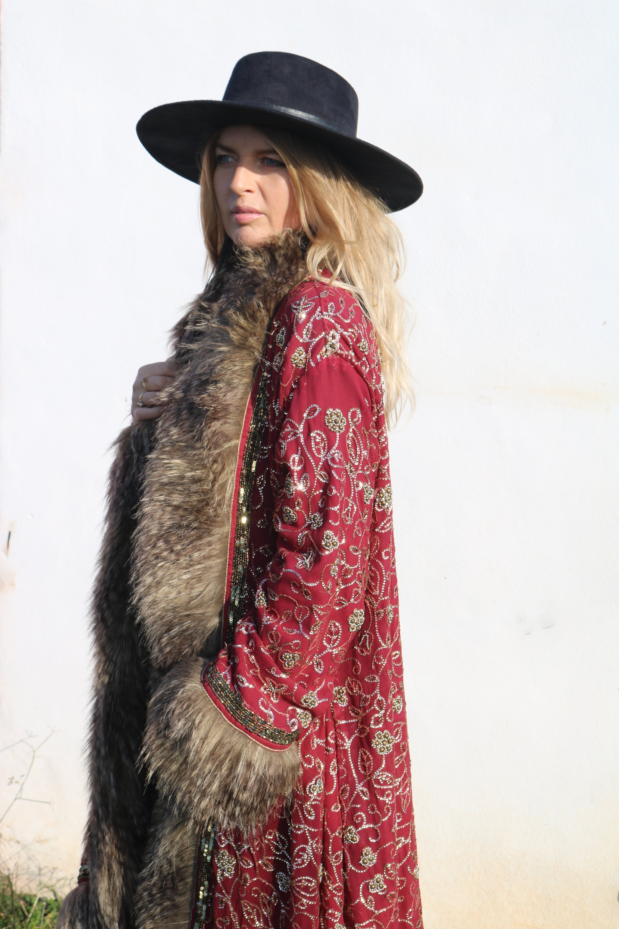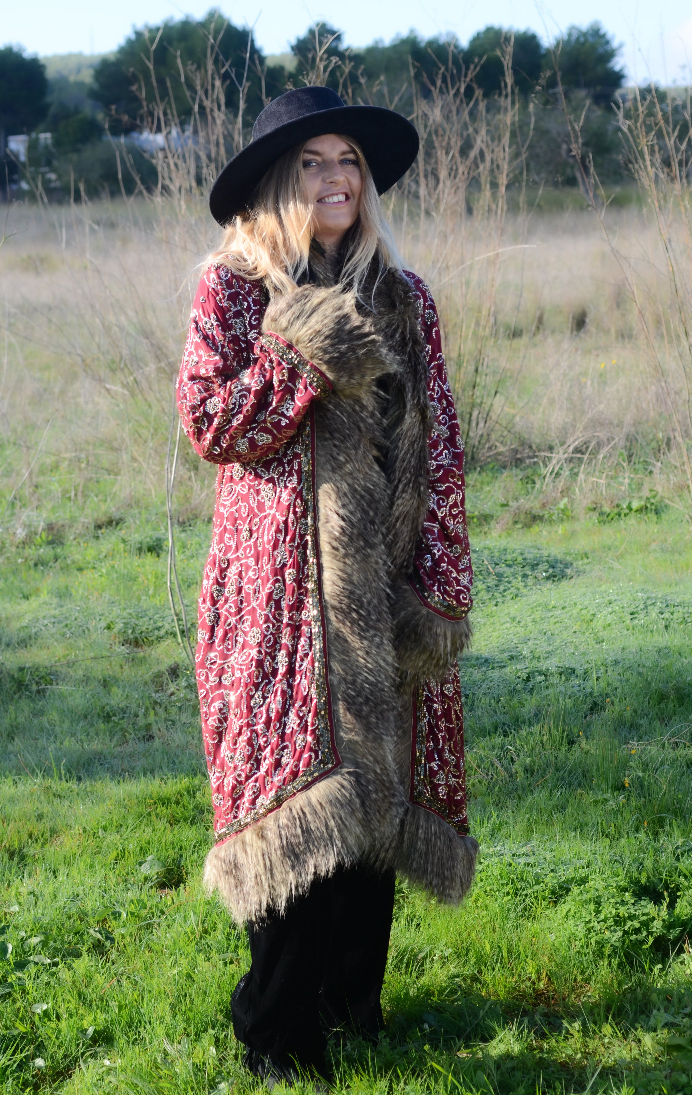 This coat is handmade with love. The coat is made of a vintage saree* and lined with cotton. It has pockets and is finished with non-natural fur. Because it's made of a vintage fabric, you won't find the same piece somewhere else.
