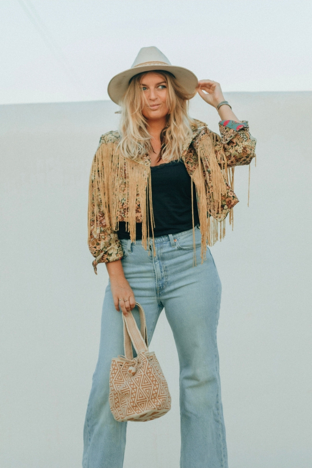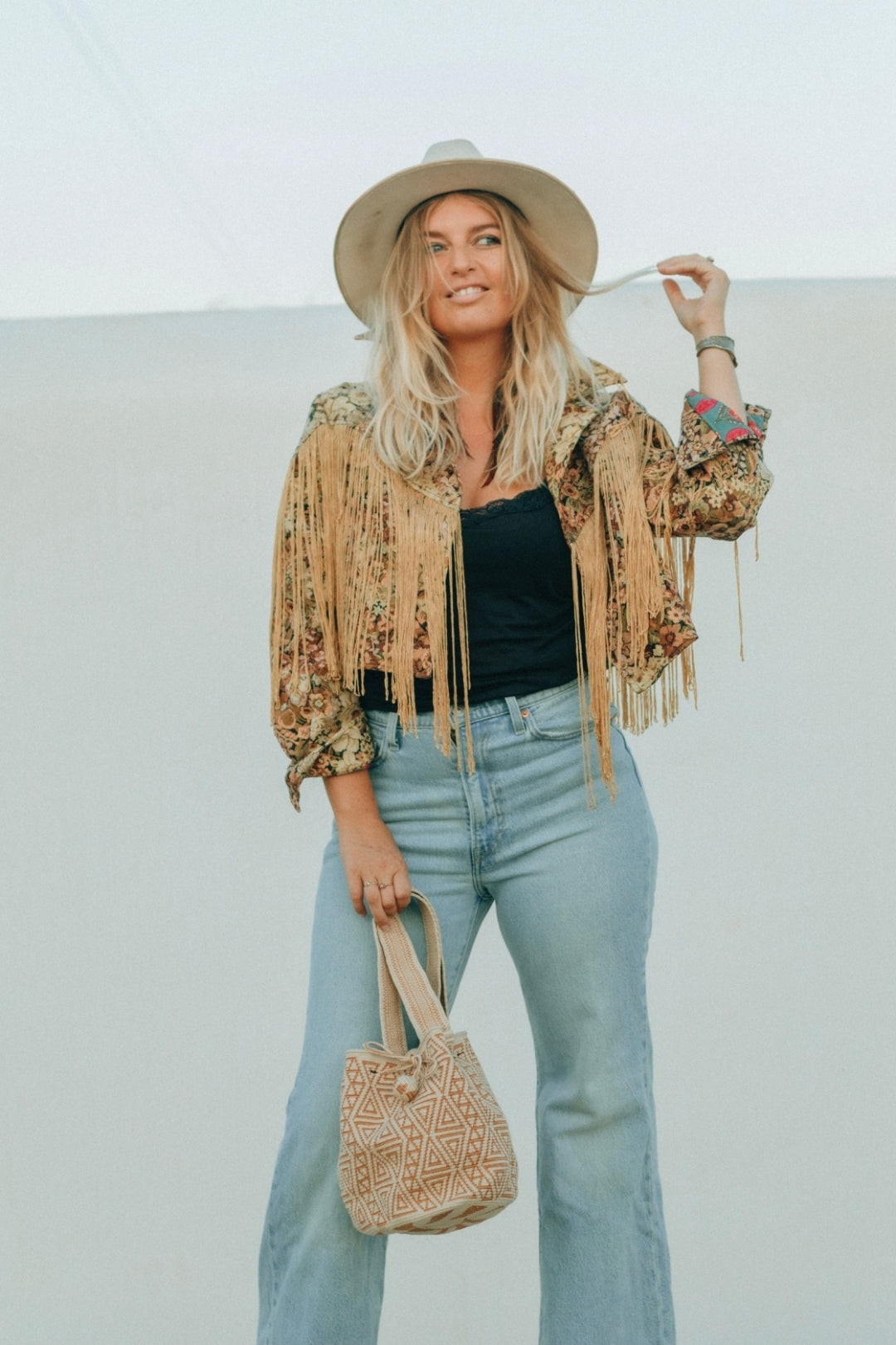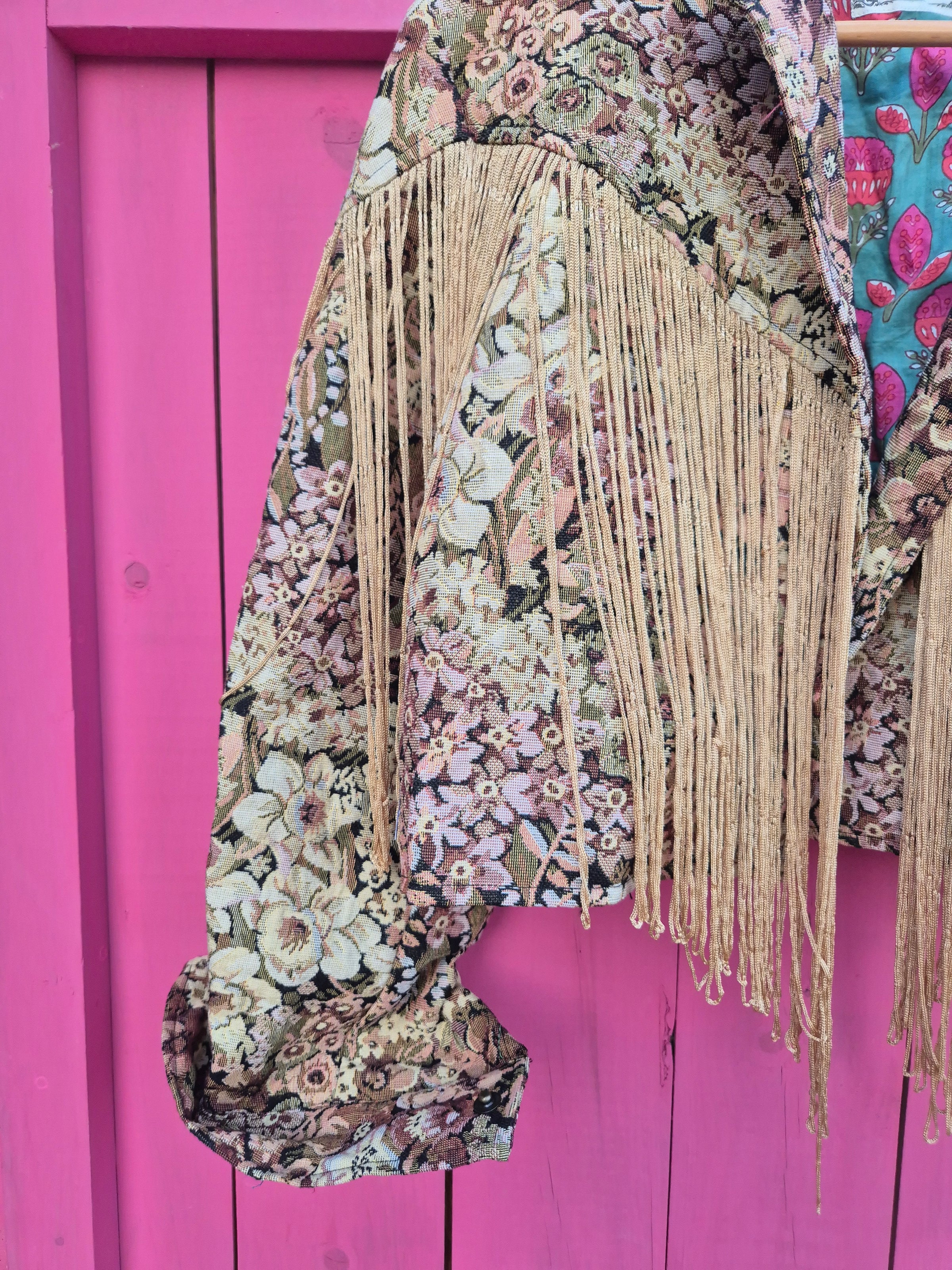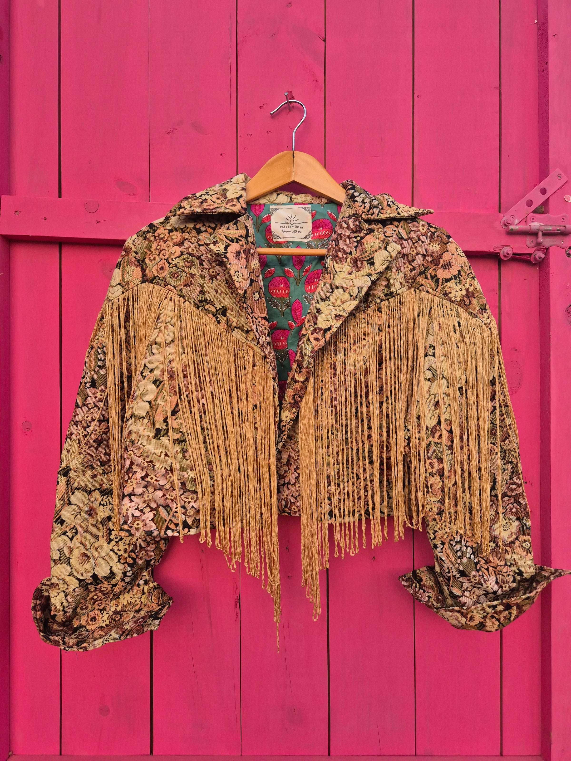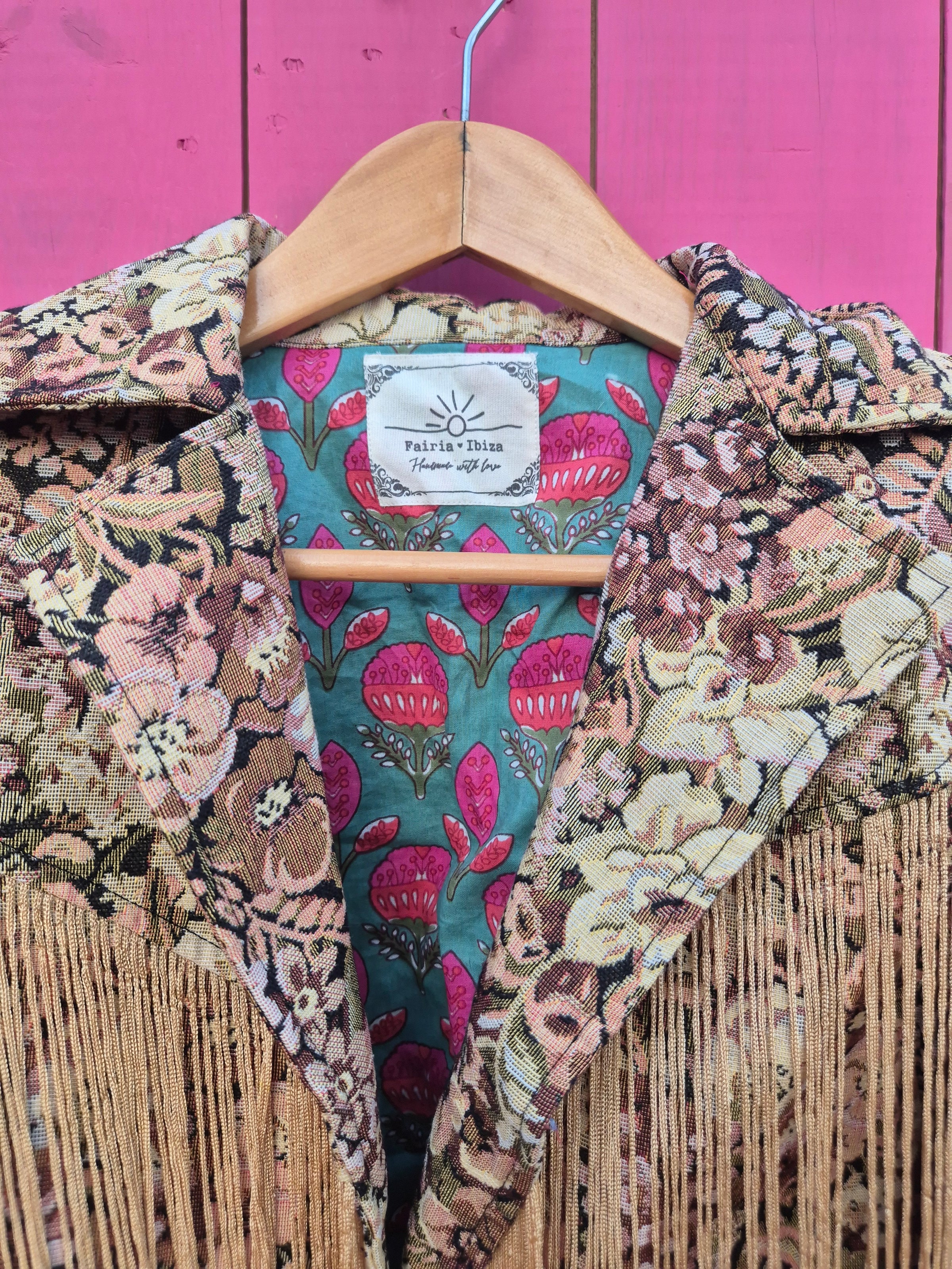 Beautiful jacket made of a strong jacquard fabric and it has an amazing cotton lining. Cowgirl style with fringes.