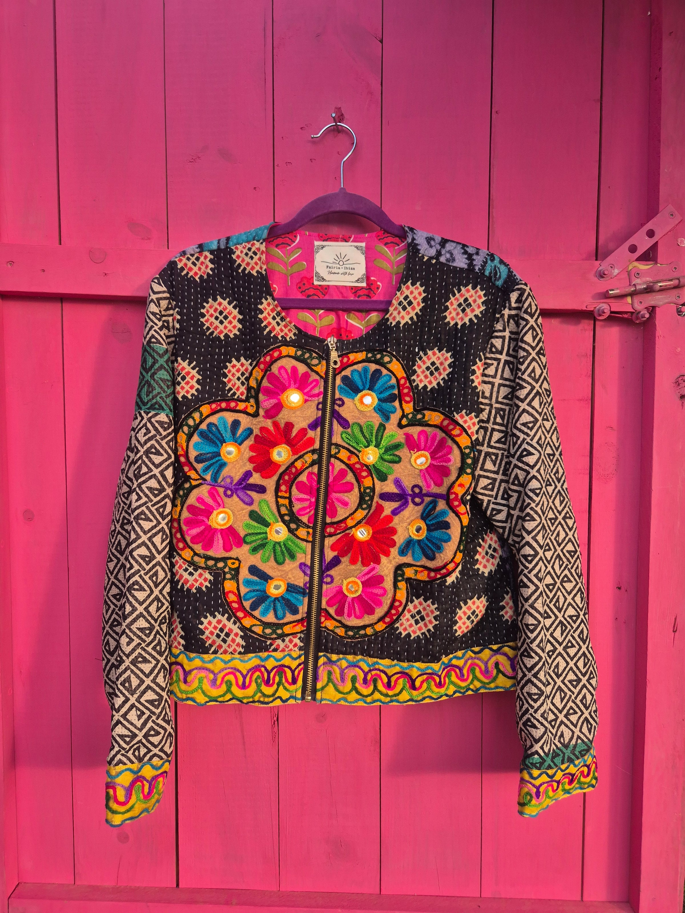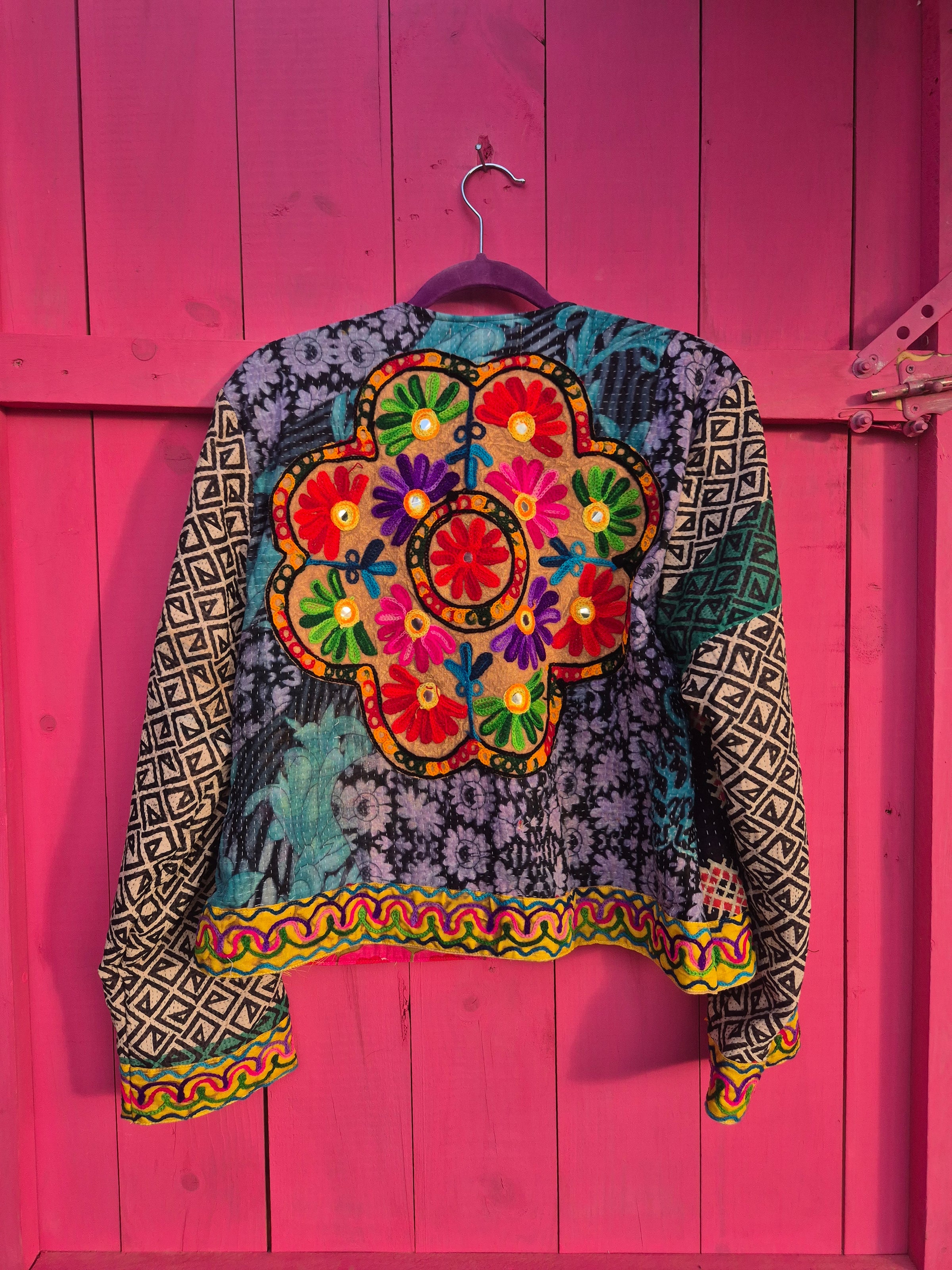 Beautiful jacket made of rare vintage Kantha fabrics and a Gujrati embroidery patch.