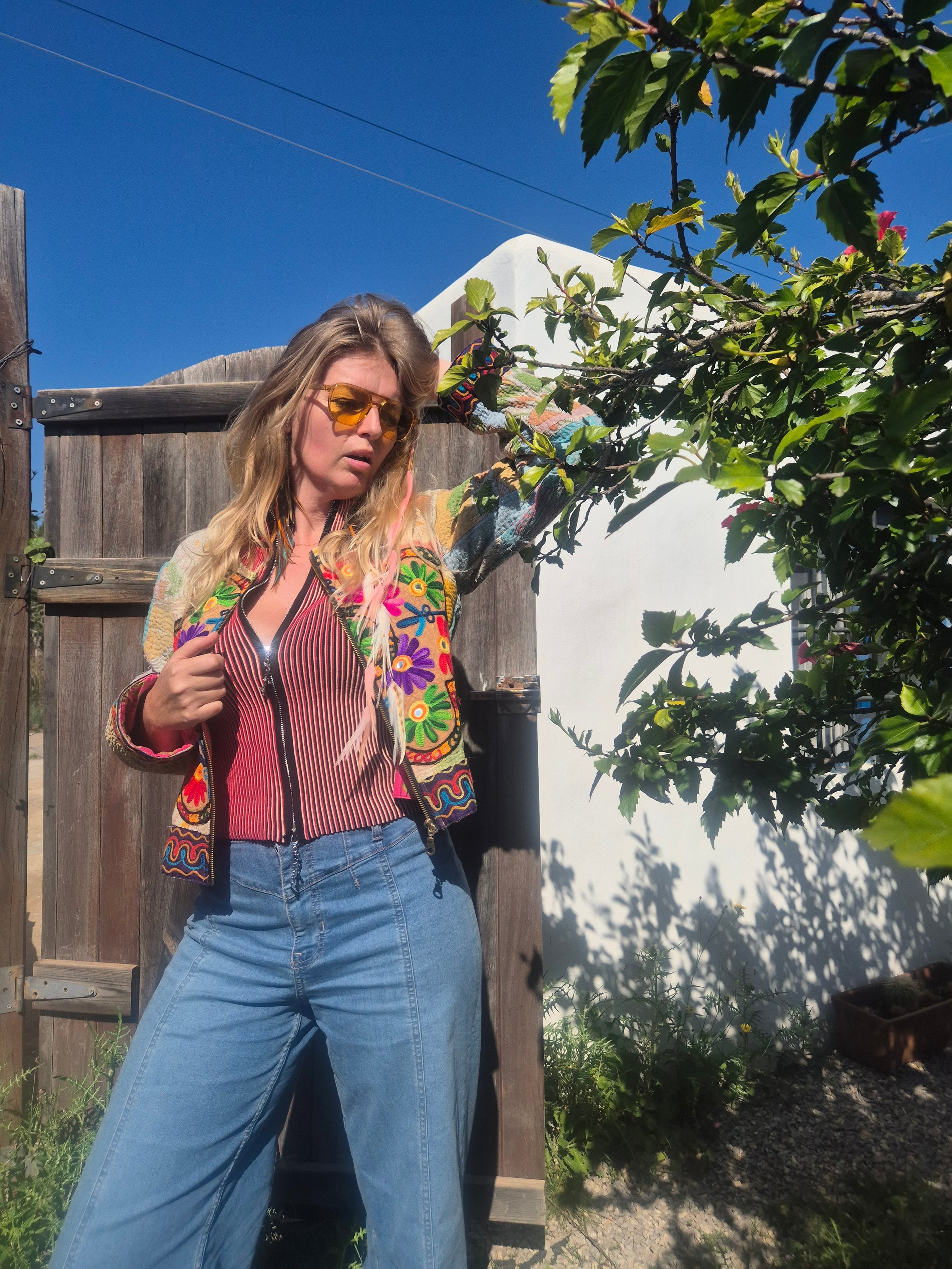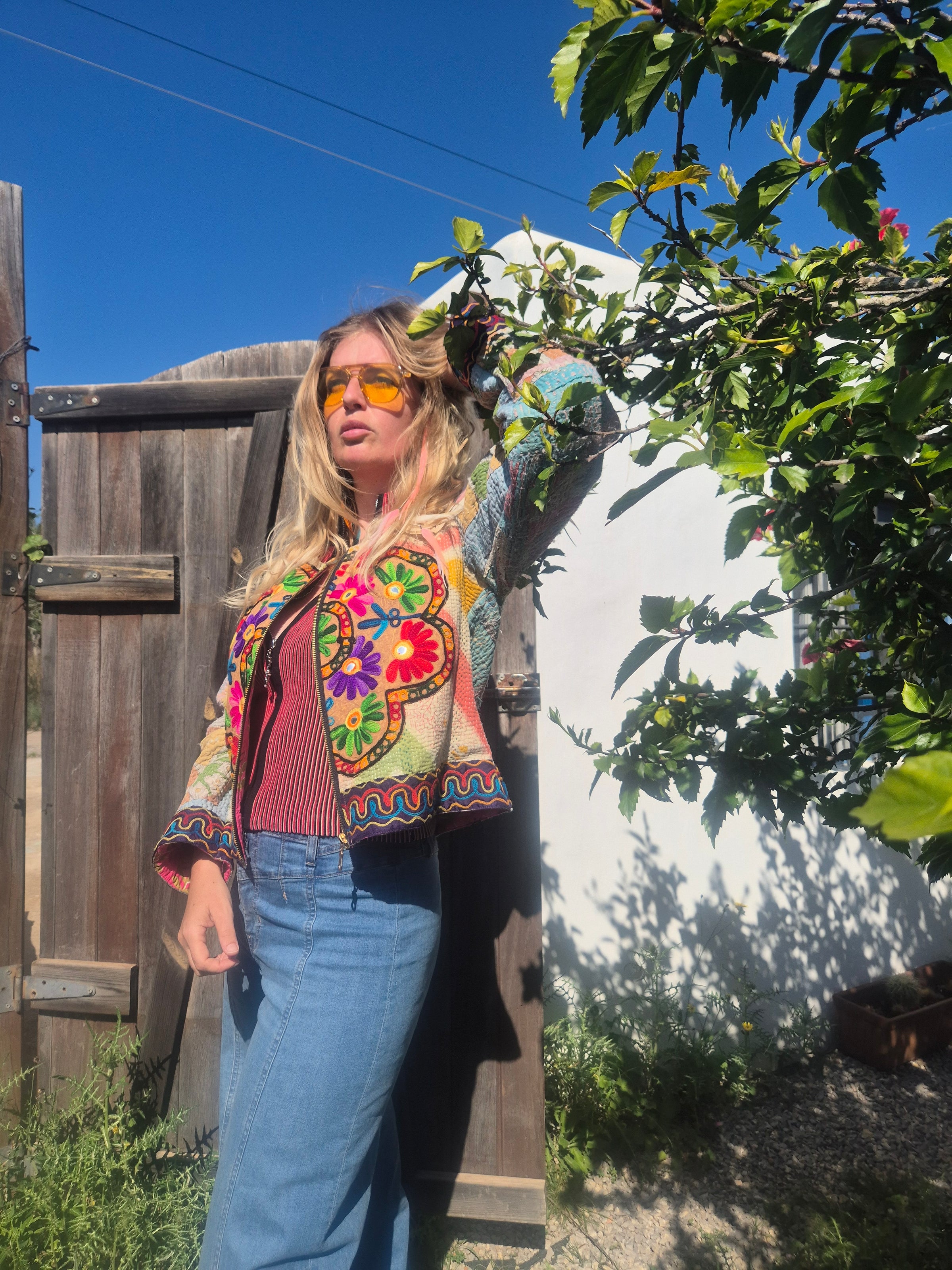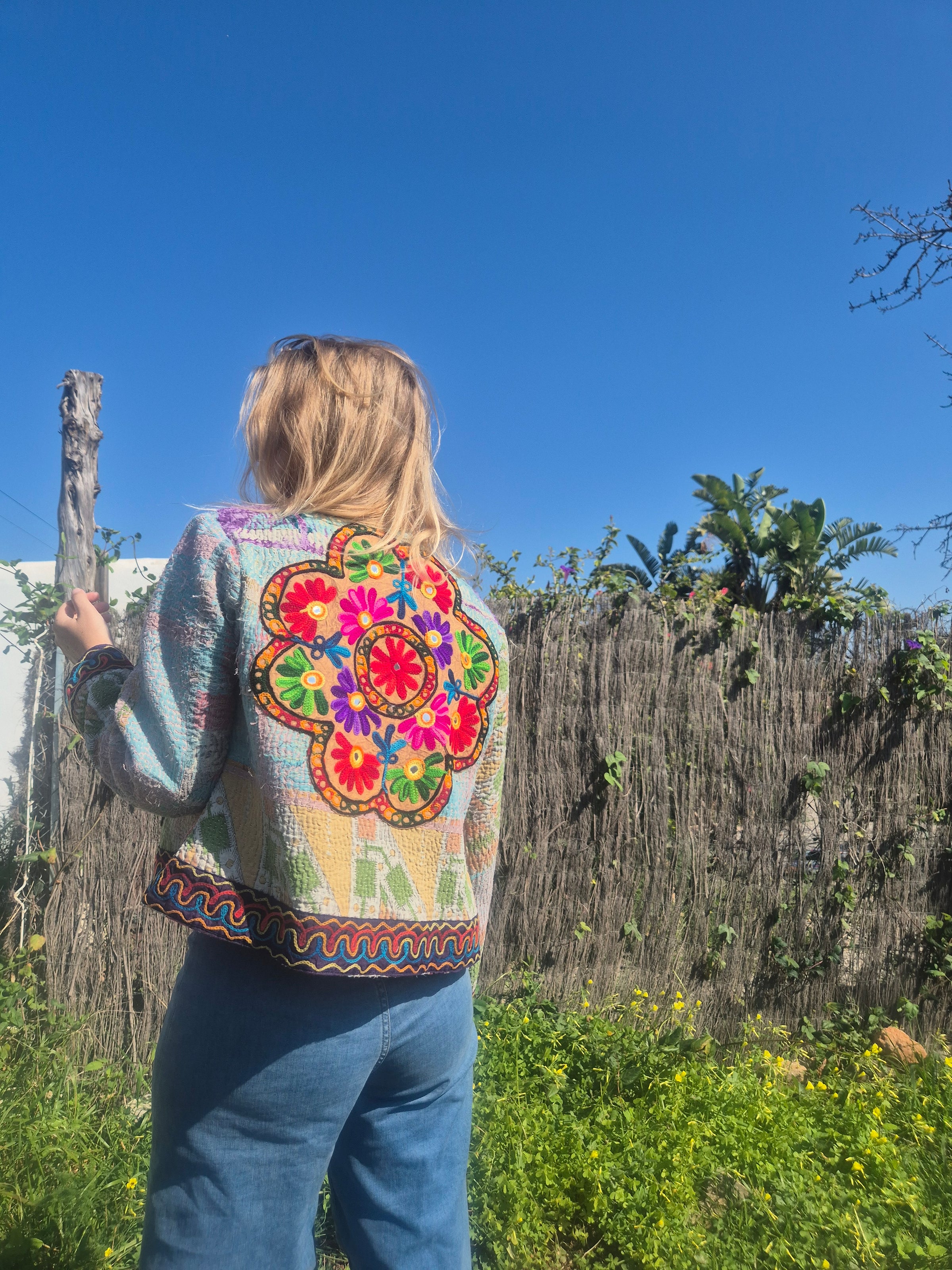 Beautiful jacket made of rare vintage Kantha fabrics and a Gujrati embroidery patch.