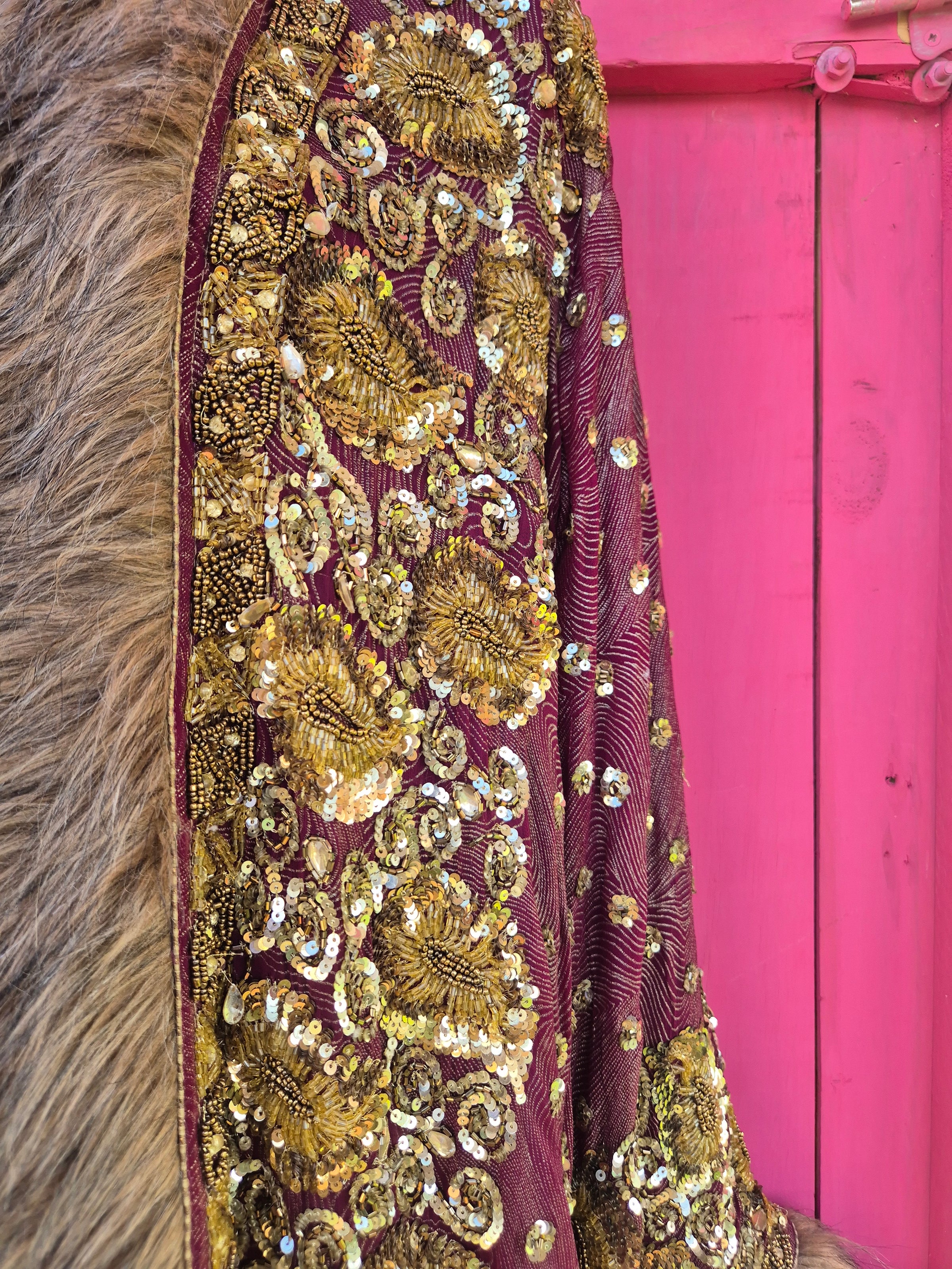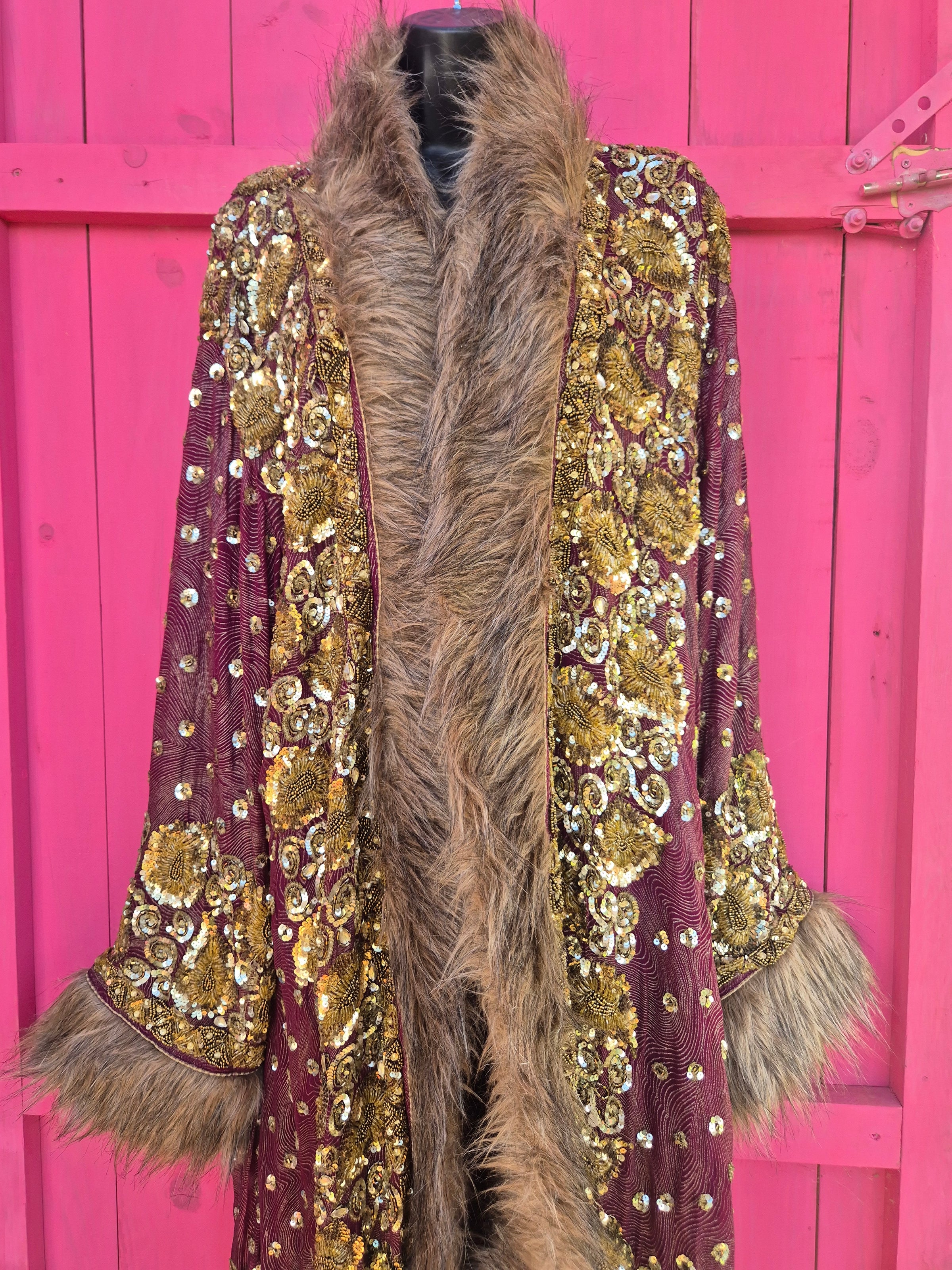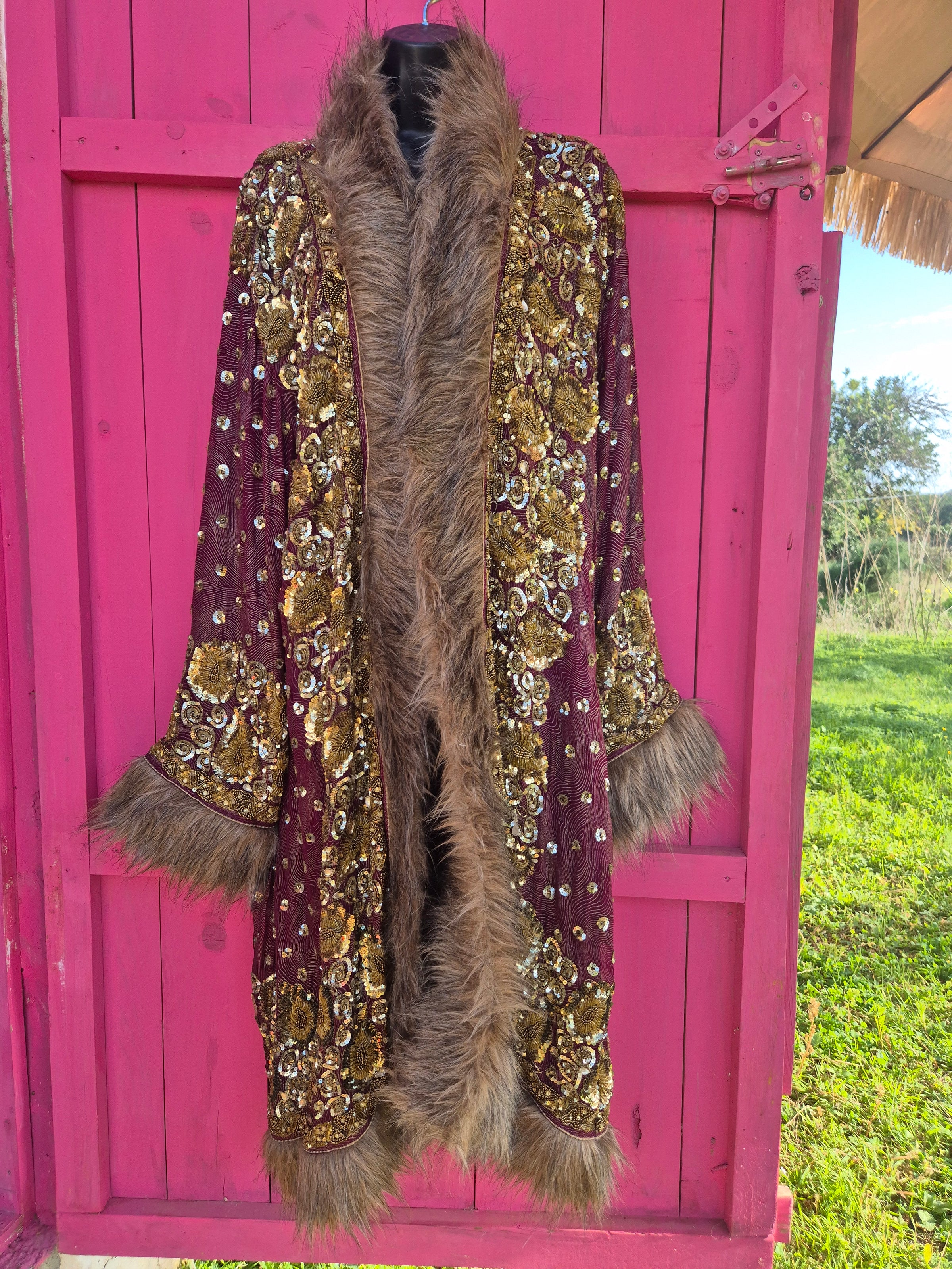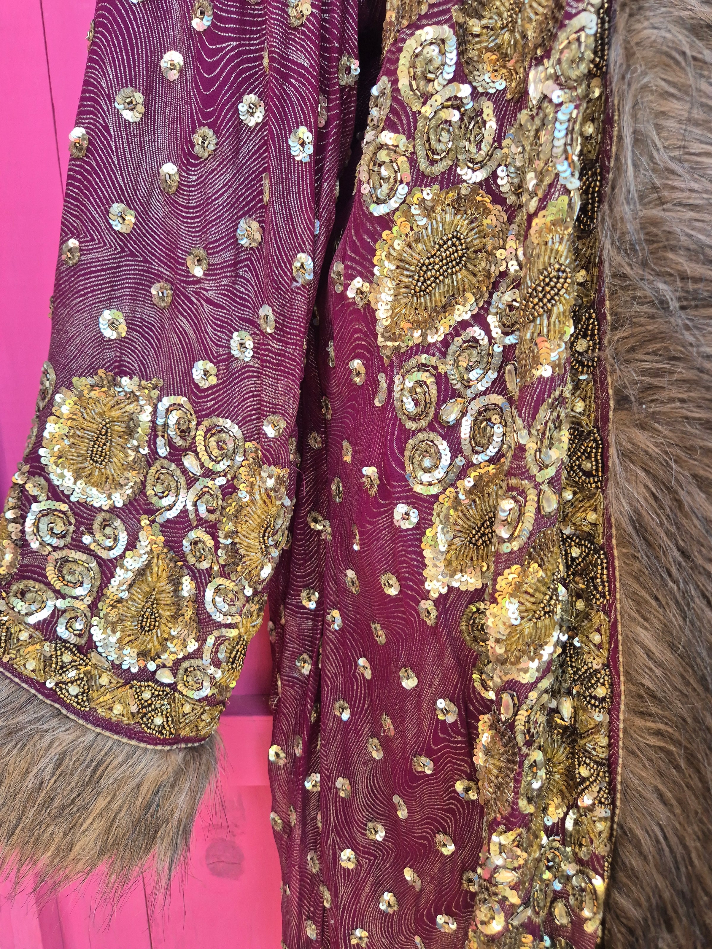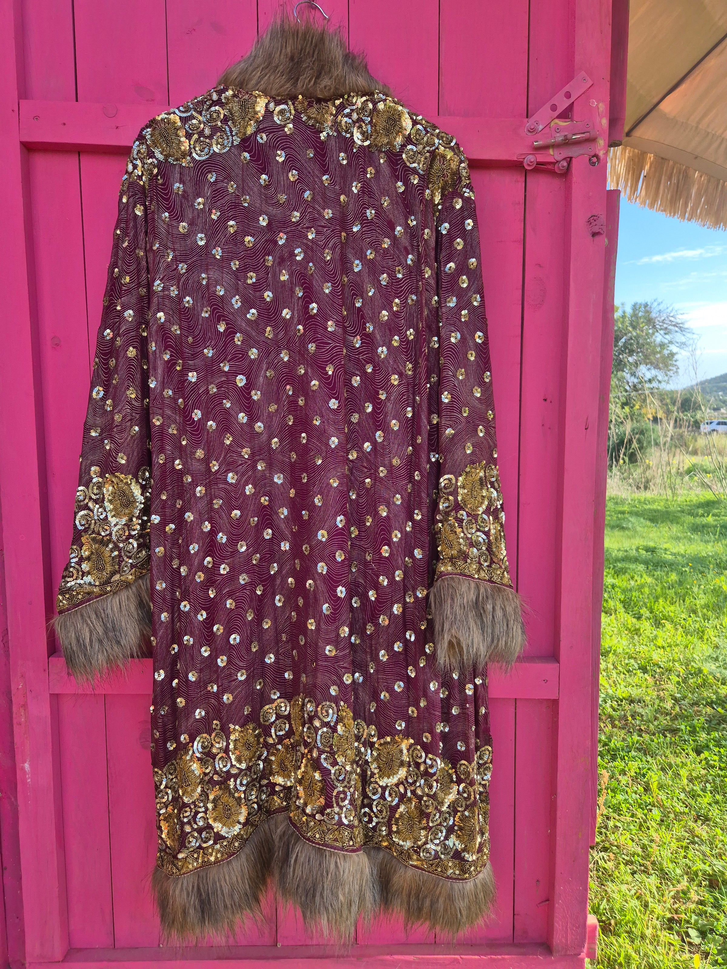 This coat is handmade with love. The coat is made of a vintage saree* and lined with cotton. It has pockets and is finished with non-natural fur. Because it's made of a vintage fabric, you won't find the same piece somewhere else.