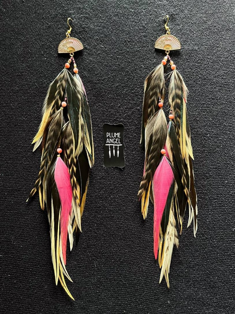Feather earrings • the Fan • Striped Feathers and a touch of pink