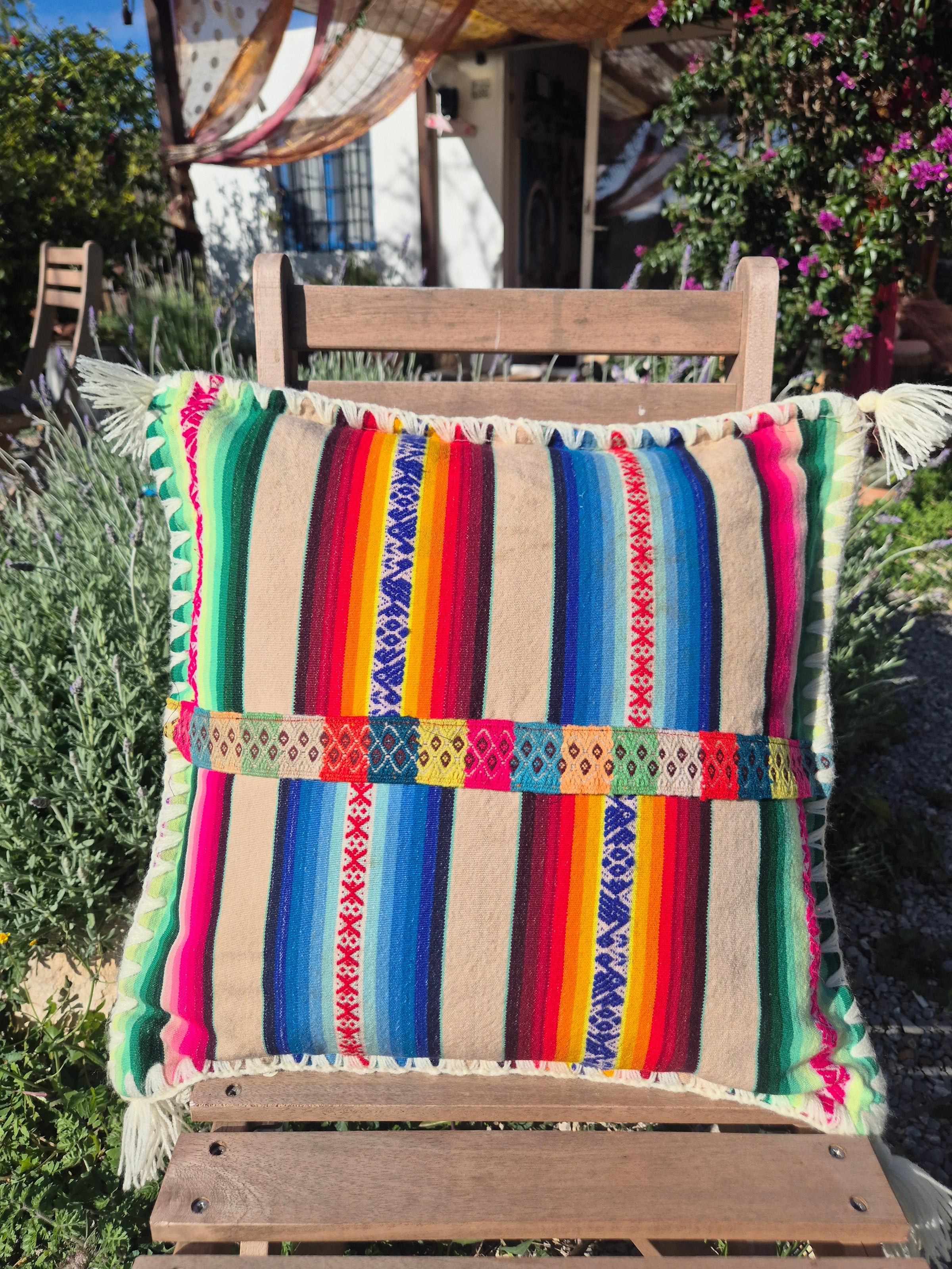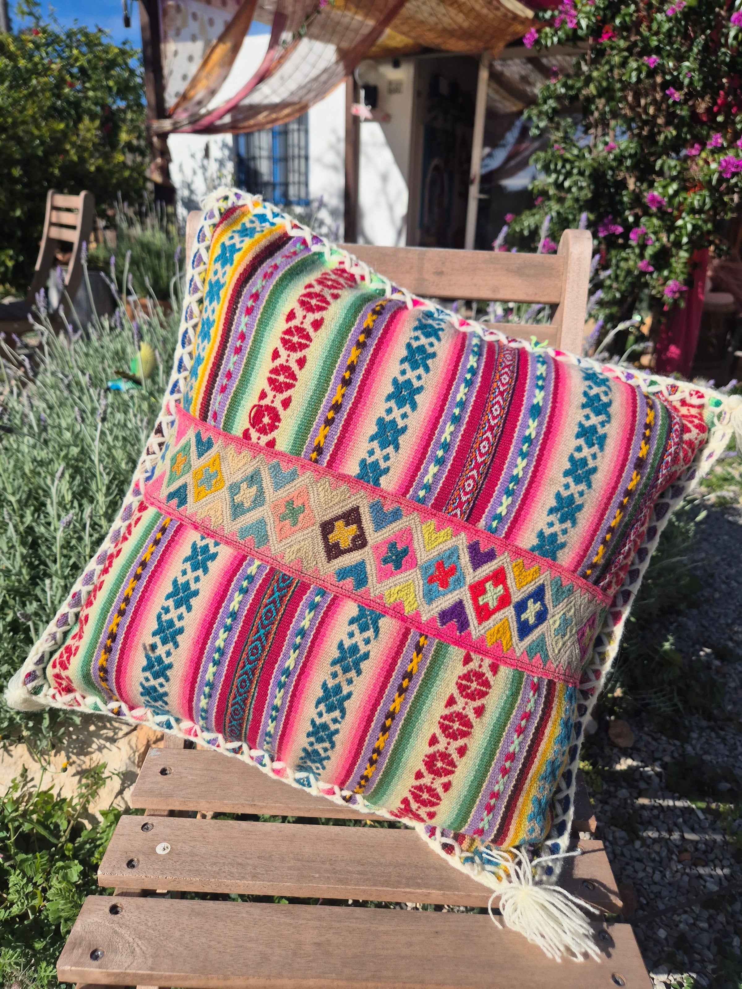 Beautiful handmade cushion cover made of vintage fabrics out of the Peruvian Andes. These vintage fabrics are also known as Aguayo fabrics. A fabric which is handwoven and handmade of natural dyed wool of sheep, lamas or alpacas.
