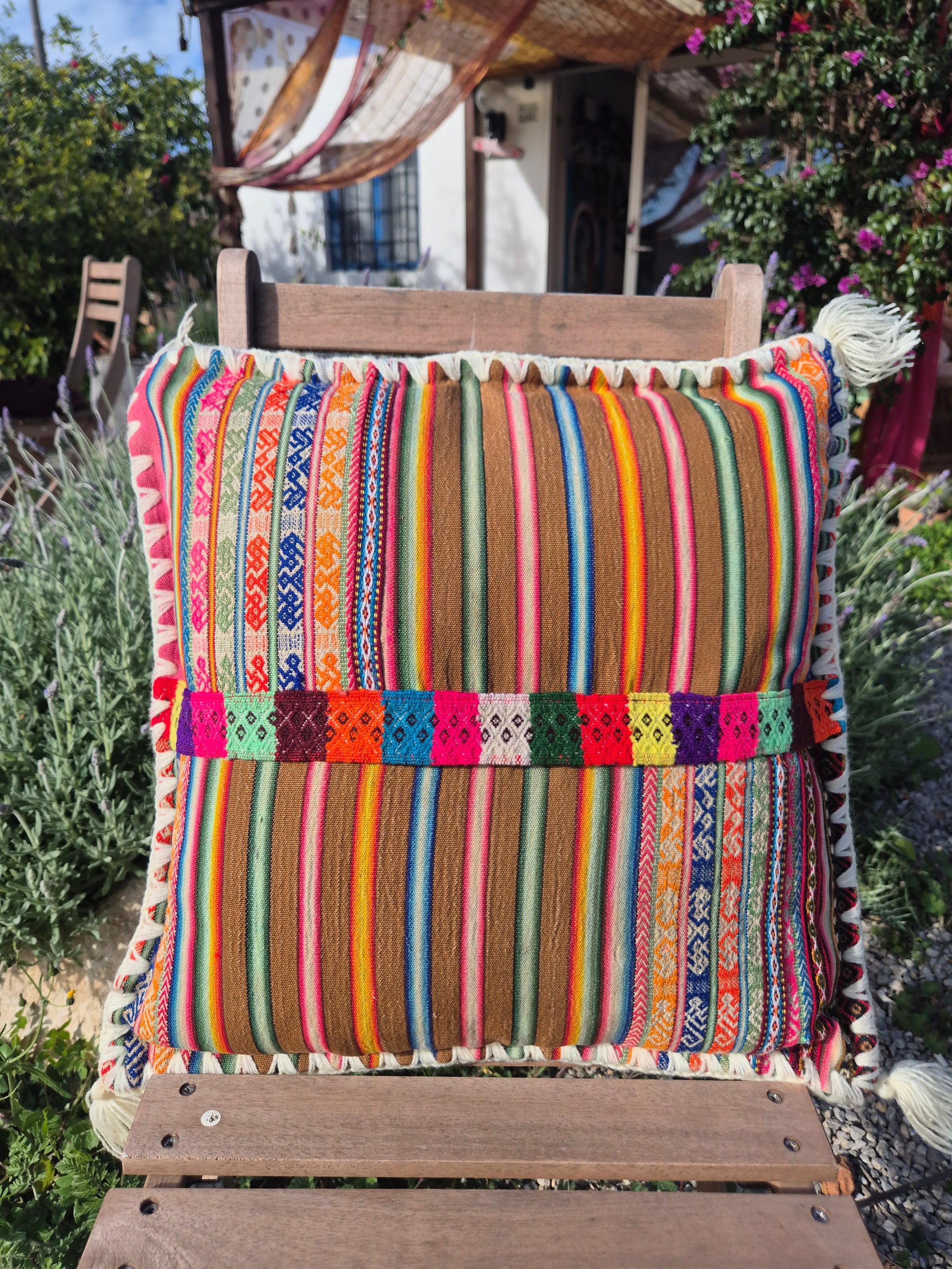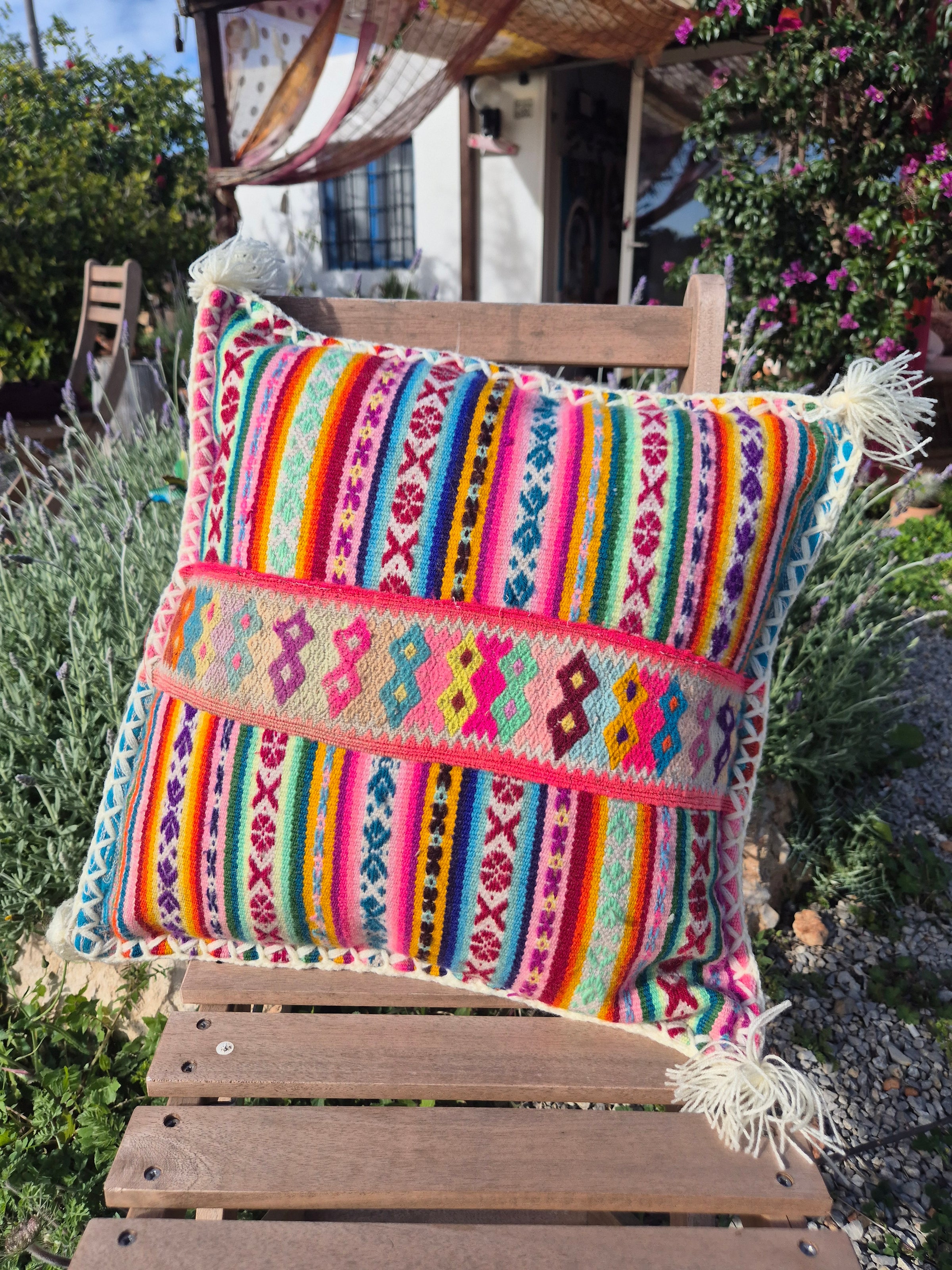 Beautiful handmade cushion cover made of vintage fabrics out of the Peruvian Andes. These vintage fabrics are also known as Aguayo fabrics. A fabric which is handwoven and handmade of natural dyed wool of sheep, lamas or alpacas.
