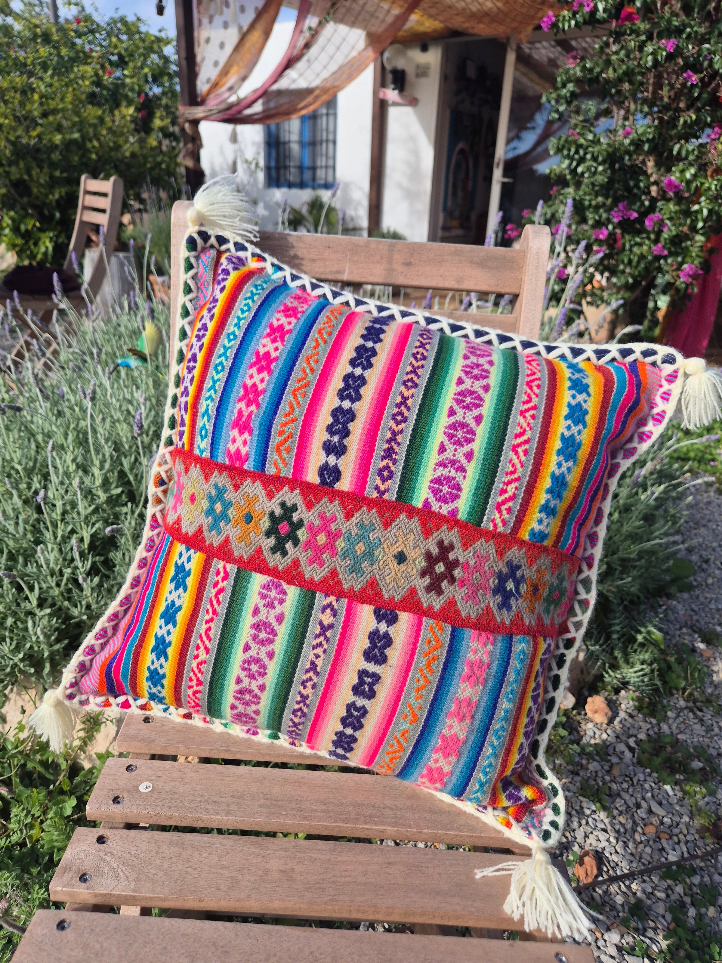 Beautiful handmade cushion cover made of vintage fabrics out of the Peruvian Andes. These vintage fabrics are also known as Aguayo fabrics. A fabric which is handwoven and handmade of natural dyed wool of sheep, lamas or alpacas.
