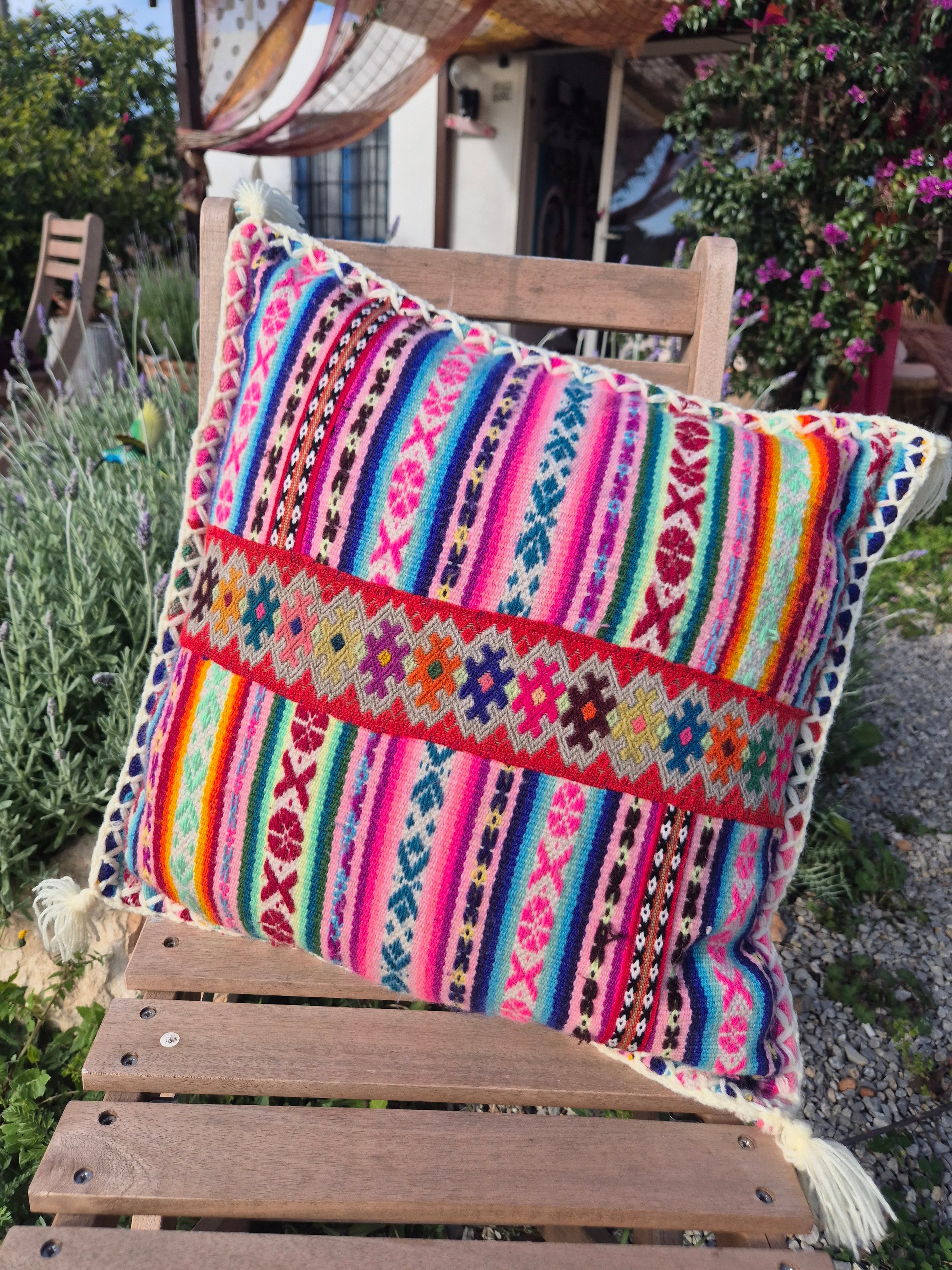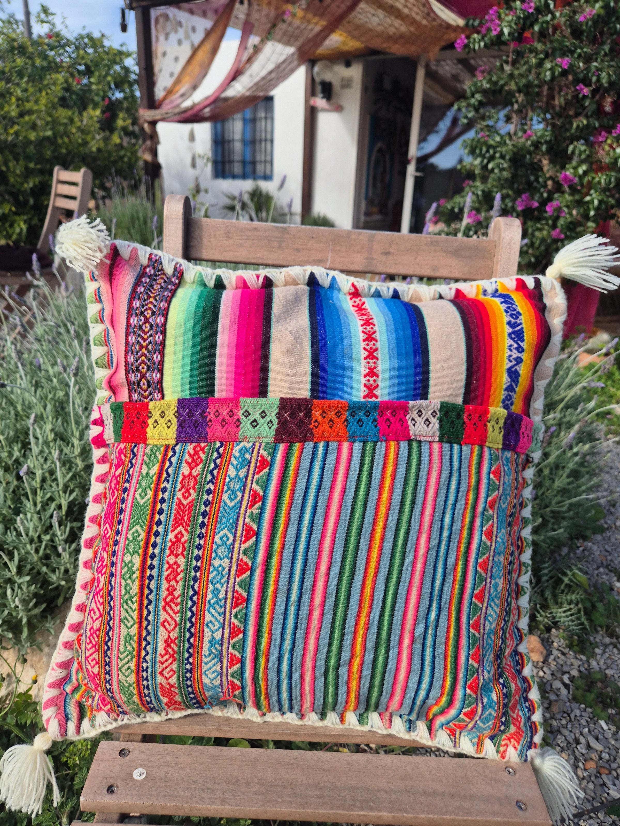 Beautiful handmade cushion cover made of vintage fabrics out of the Peruvian Andes. These vintage fabrics are also known as Aguayo fabrics. A fabric which is handwoven and handmade of natural dyed wool of sheep, lamas or alpacas.