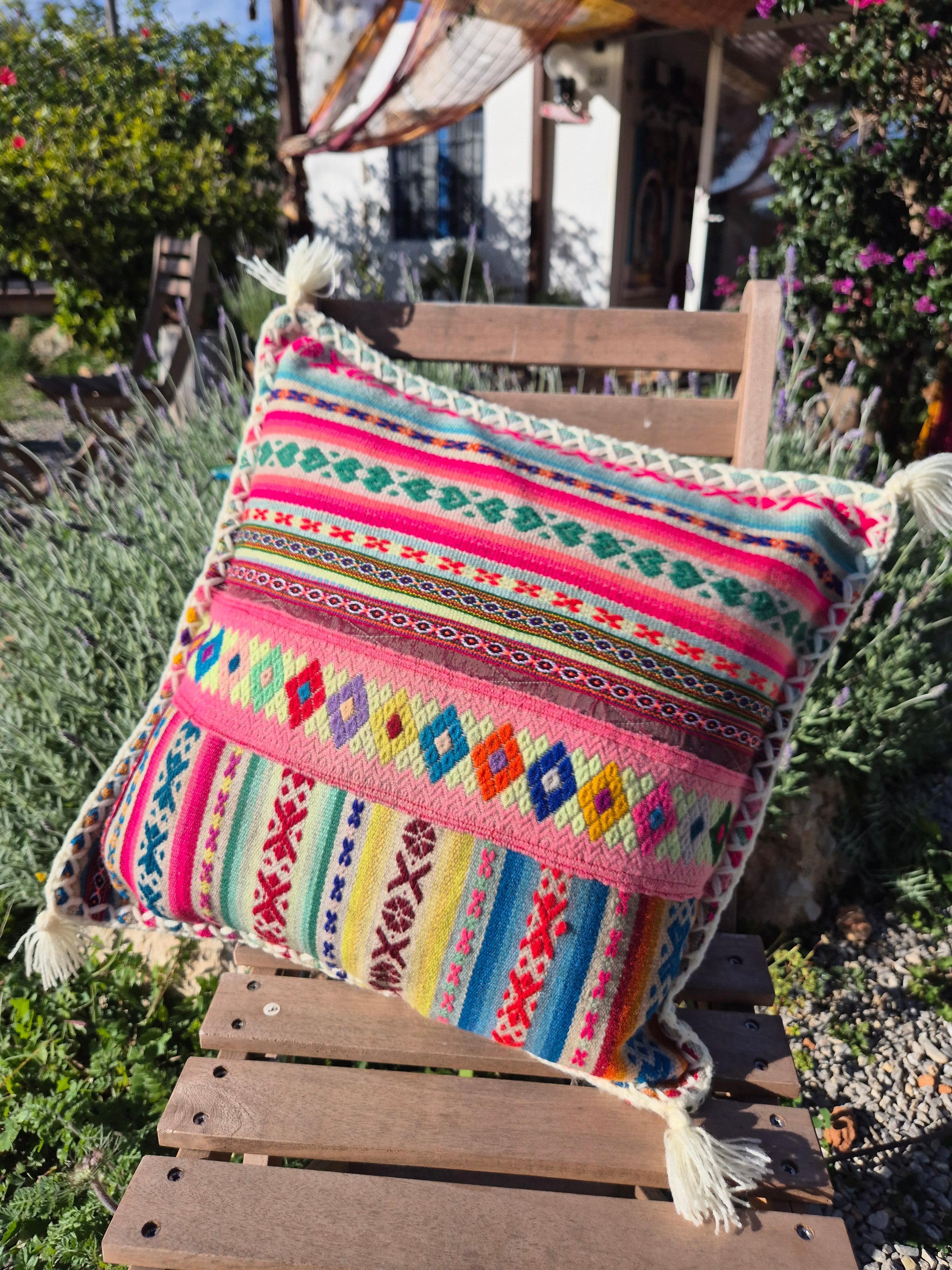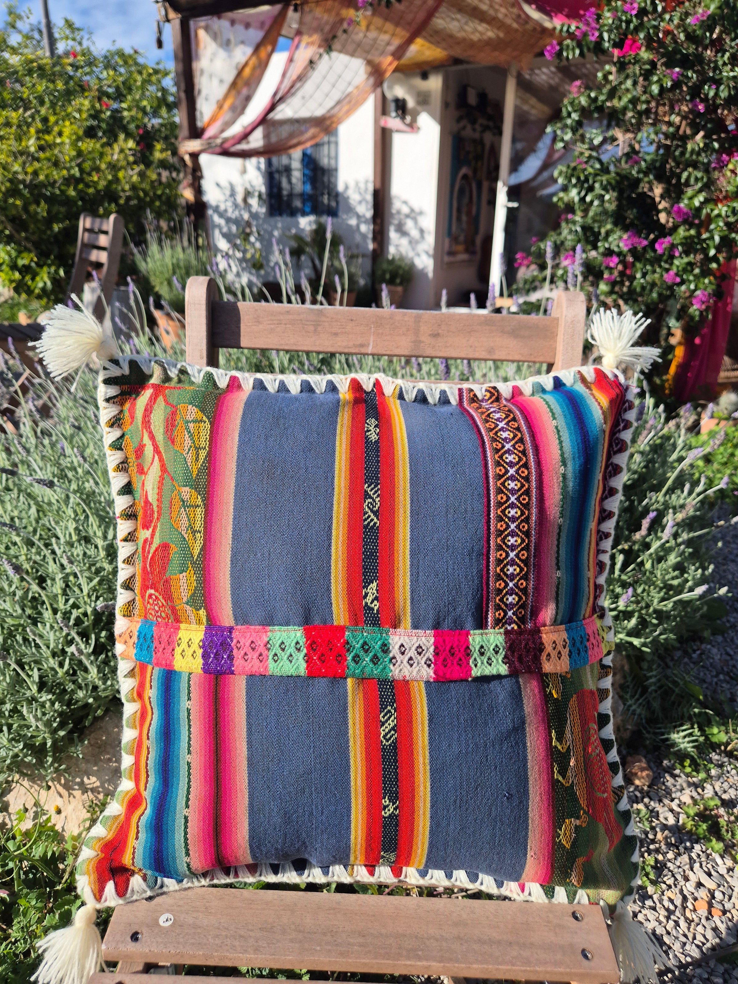 Beautiful handmade cushion cover made of vintage fabrics out of the Peruvian Andes. These vintage fabrics are also known as Aguayo fabrics. A fabric which is handwoven and handmade of natural dyed wool of sheep, lamas or alpacas.