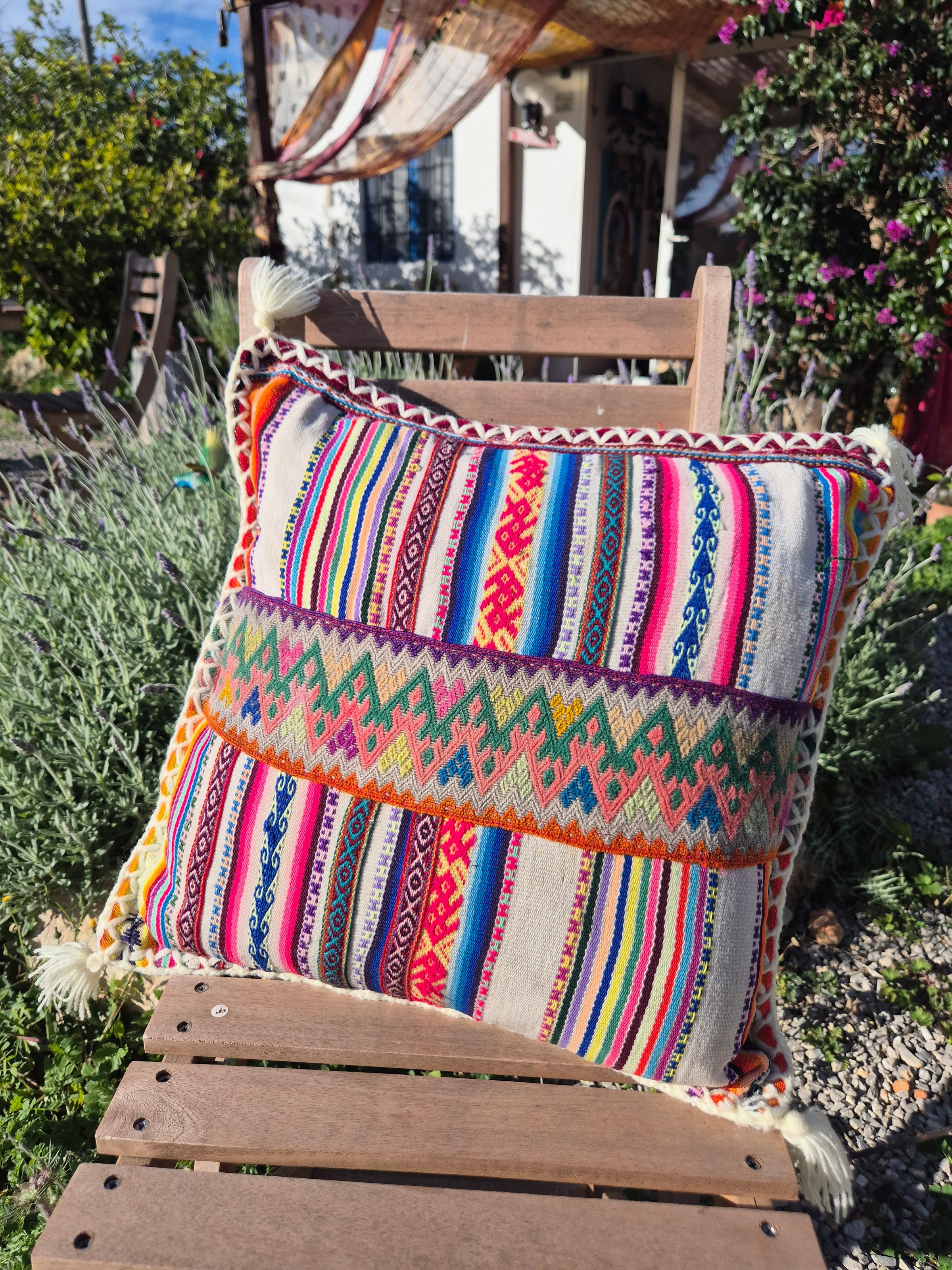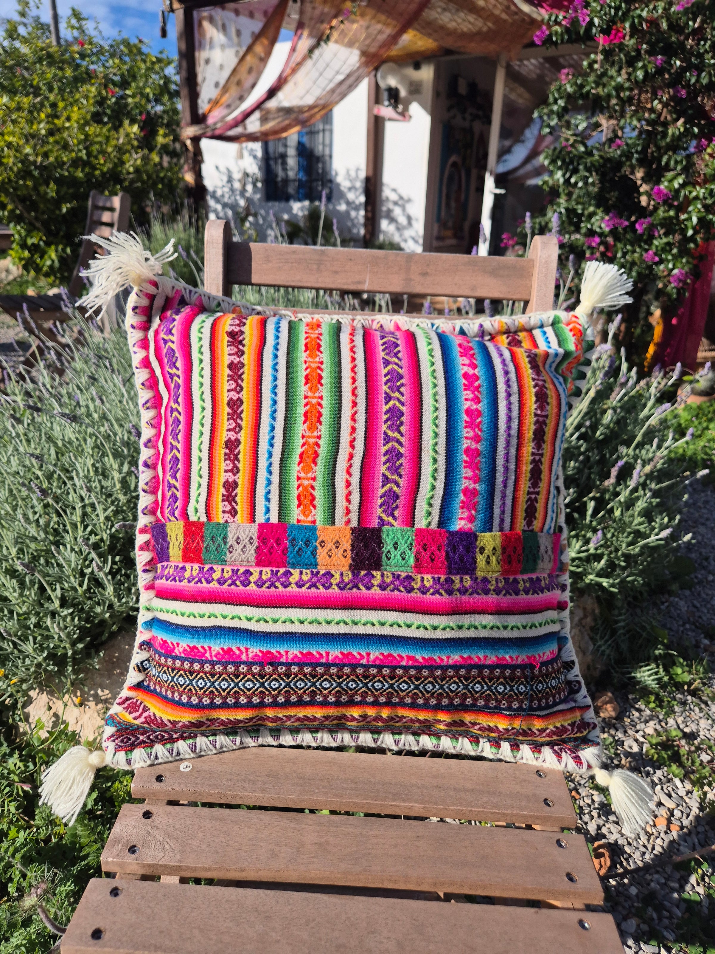 Beautiful handmade cushion cover made of vintage fabrics out of the Peruvian Andes. These vintage fabrics are also known as Aguayo fabrics. A fabric which is handwoven and handmade of natural dyed wool of sheep, lamas or alpacas.