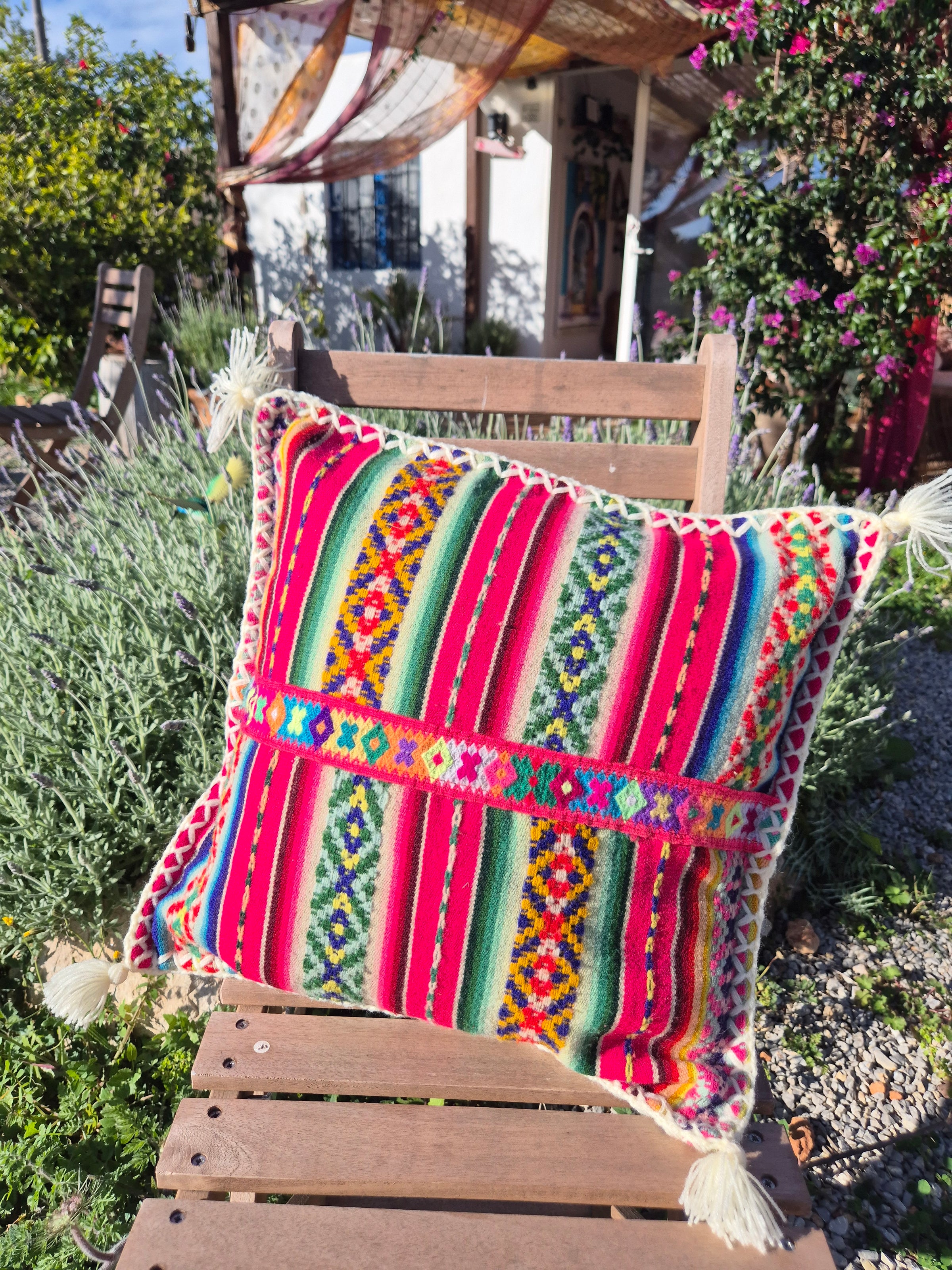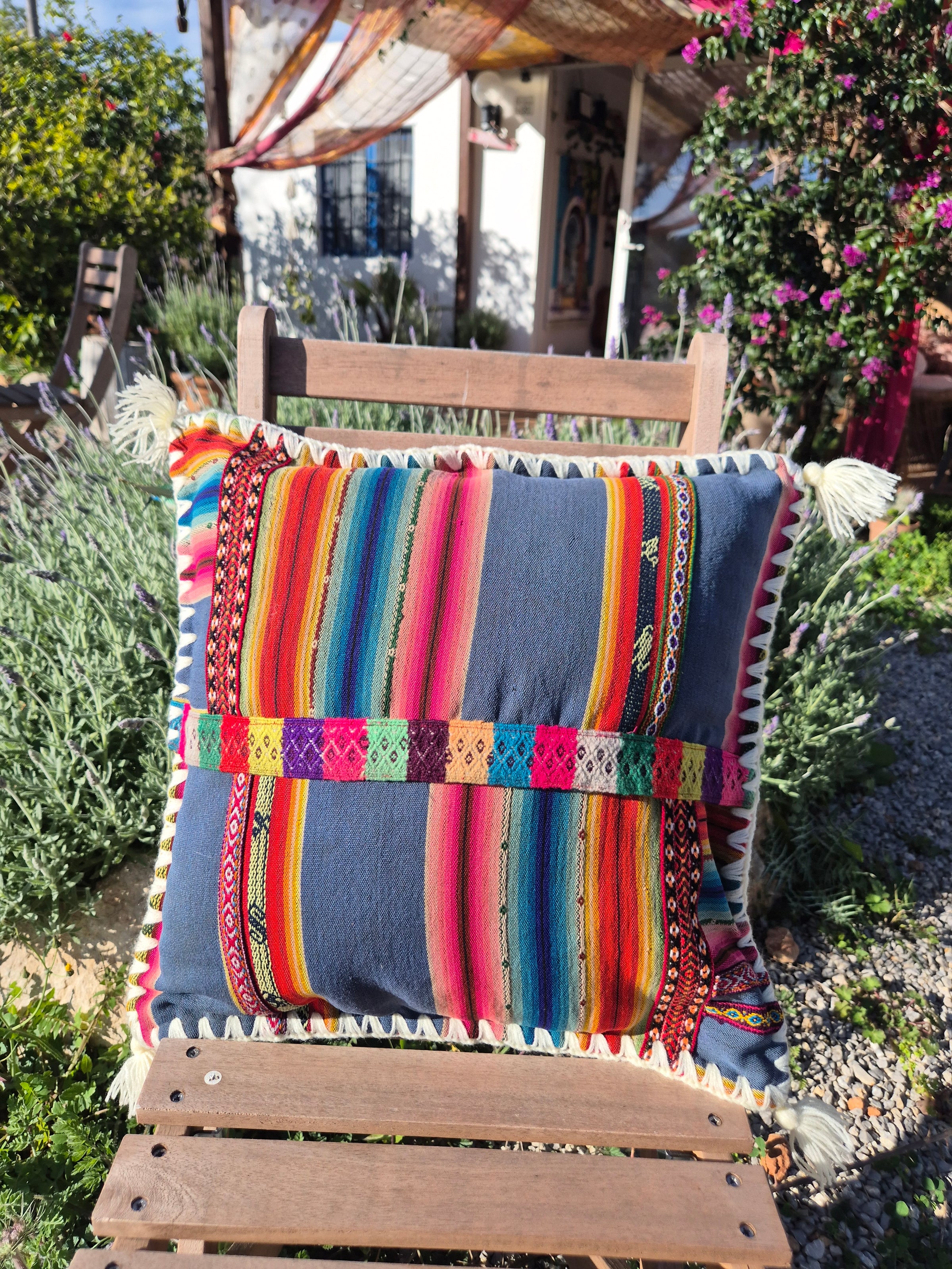 Beautiful handmade cushion cover made of vintage fabrics out of the Peruvian Andes. These vintage fabrics are also known as Aguayo fabrics. A fabric which is handwoven and handmade of natural dyed wool of sheep, lamas or alpacas.
