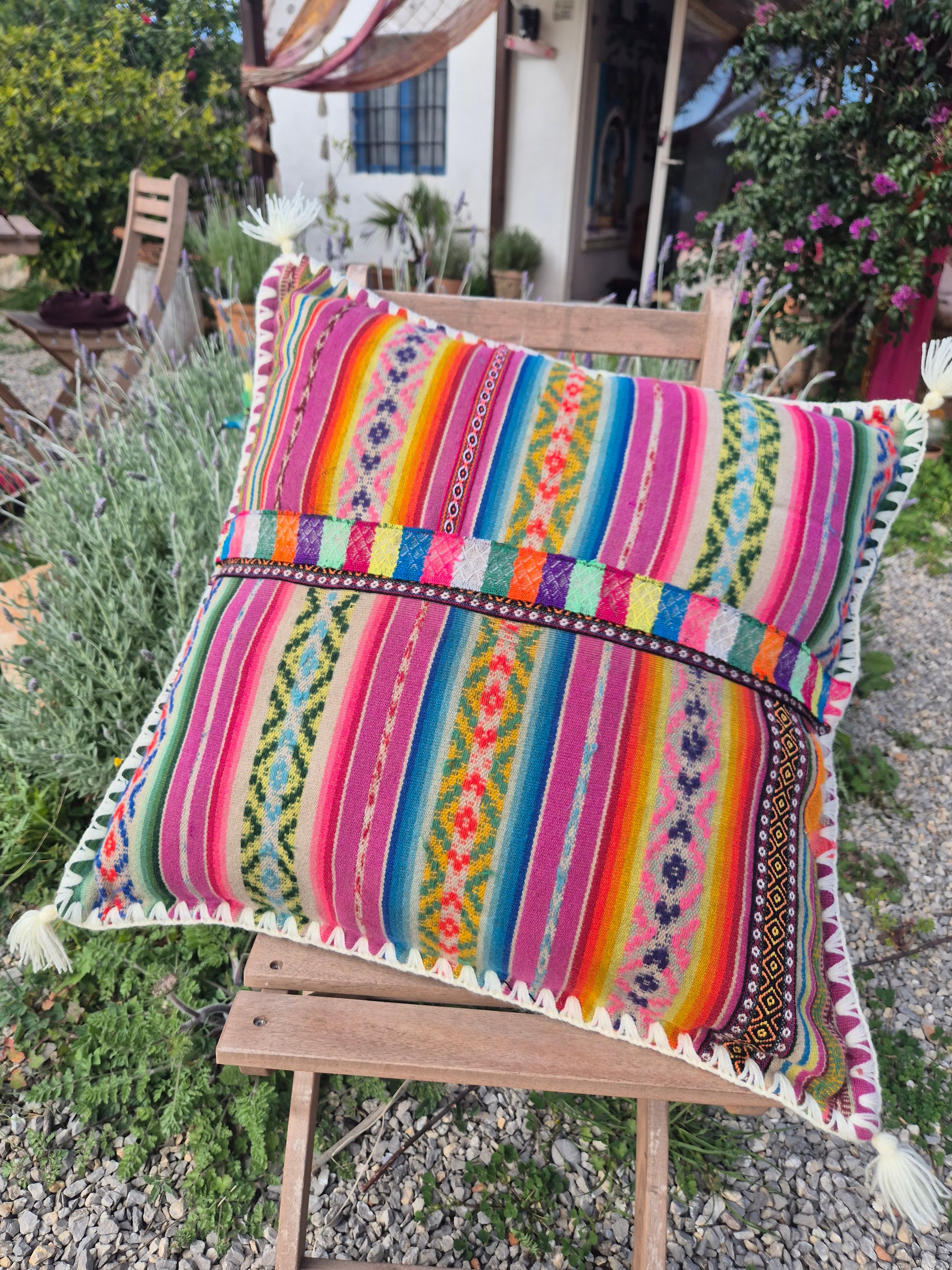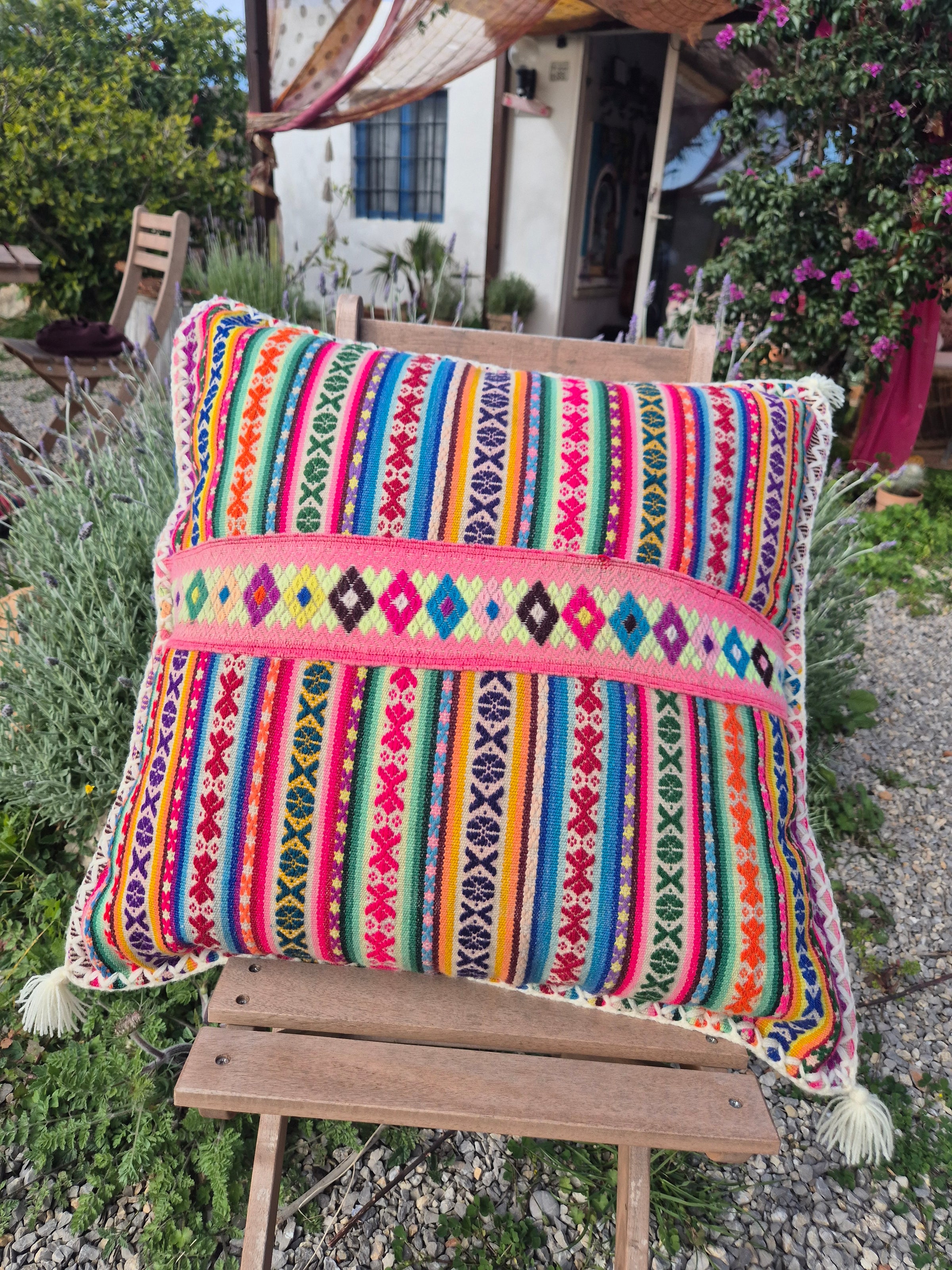 Beautiful handmade cushion cover made of vintage fabrics out of the Peruvian Andes. These vintage fabrics are also known as Aguayo fabrics. A fabric which is handwoven and handmade of natural dyed wool of sheep, lamas or alpacas.