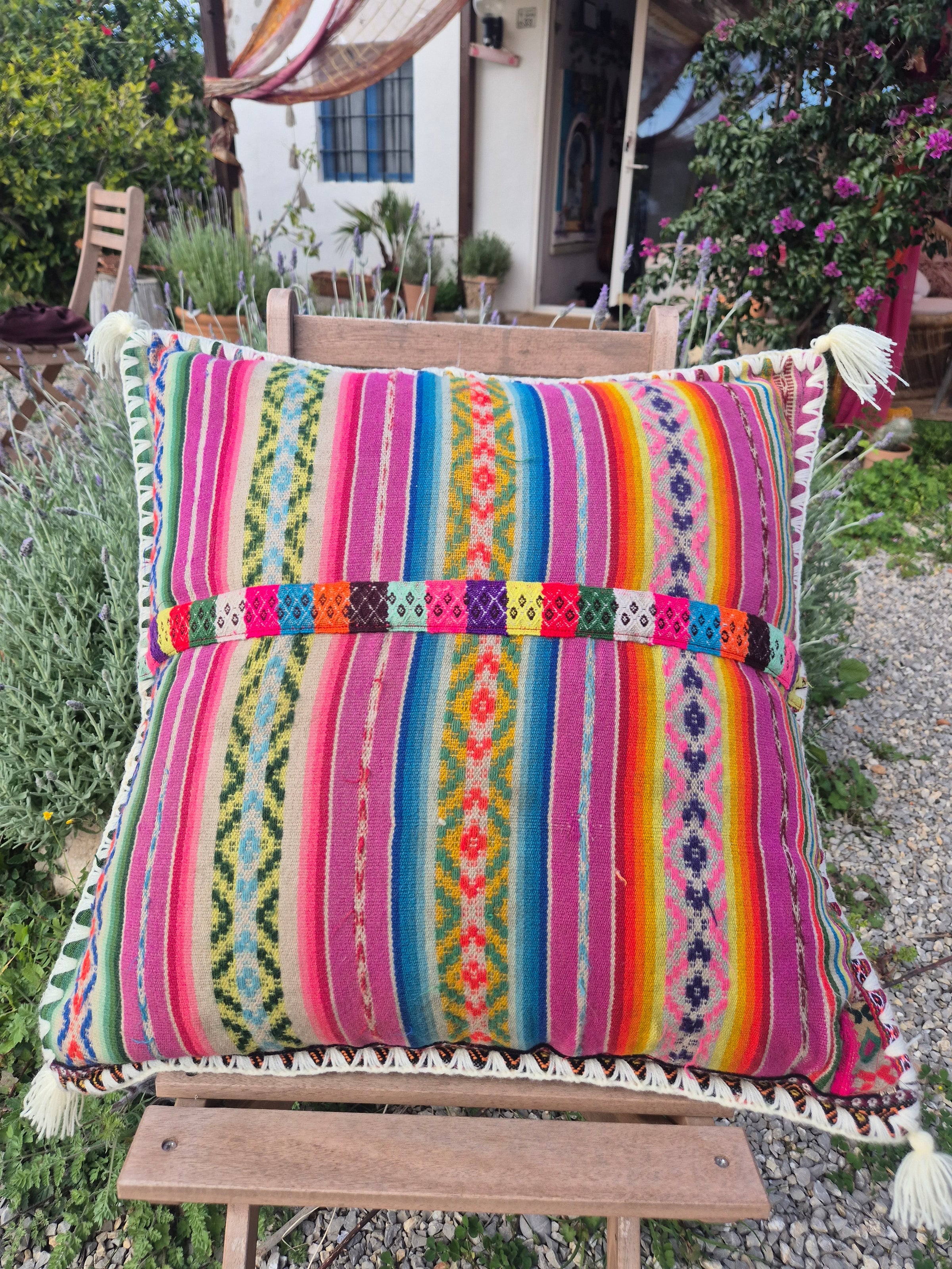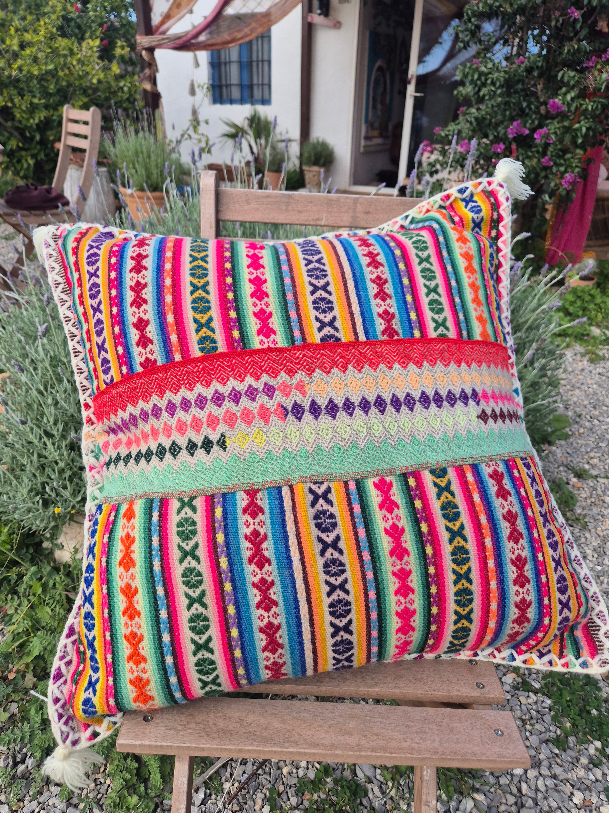 Beautiful handmade cushion cover made of vintage fabrics out of the Peruvian Andes. These vintage fabrics are also known as Aguayo fabrics. A fabric which is handwoven and handmade of natural dyed wool of sheep, lamas or alpacas.