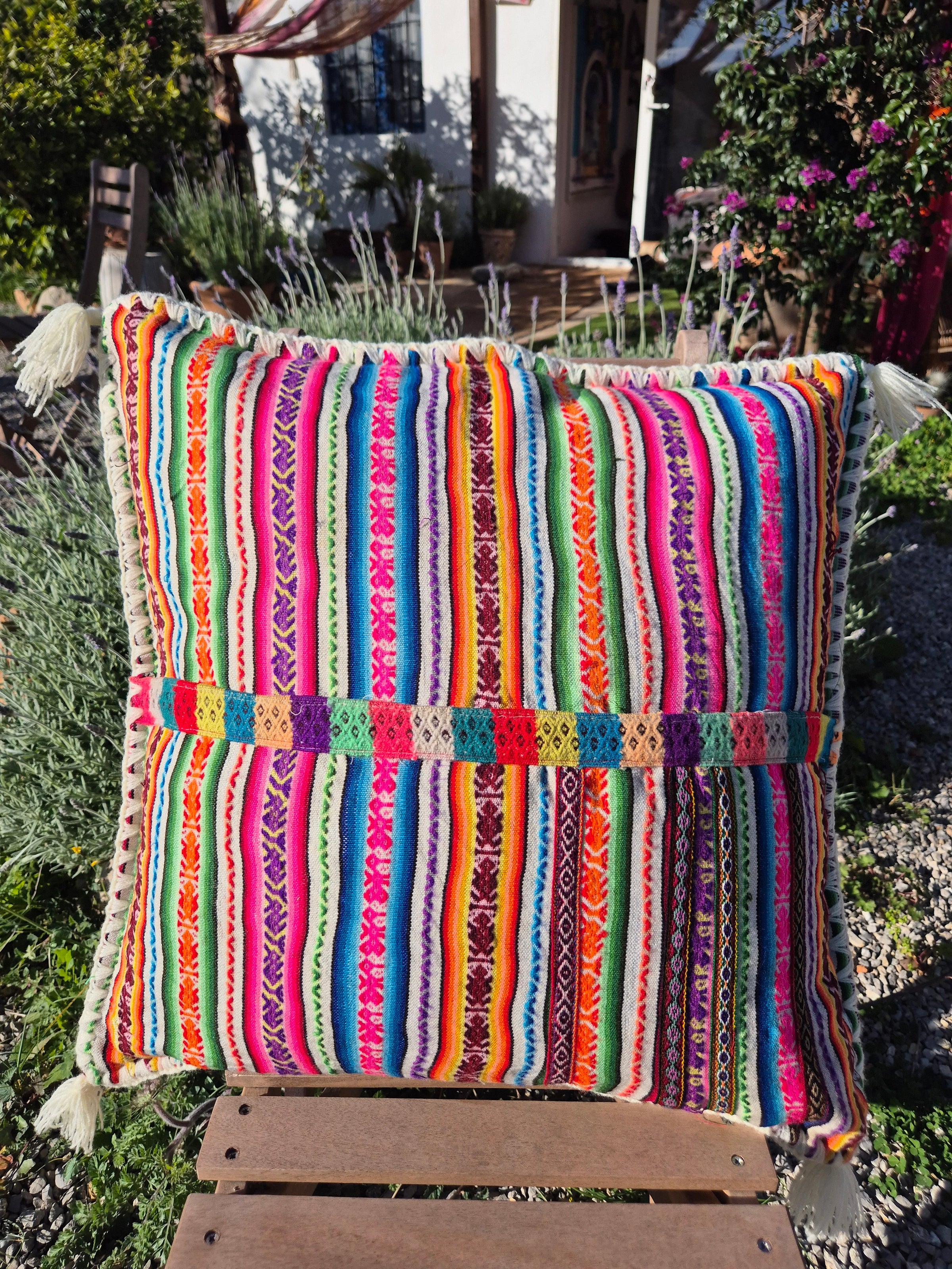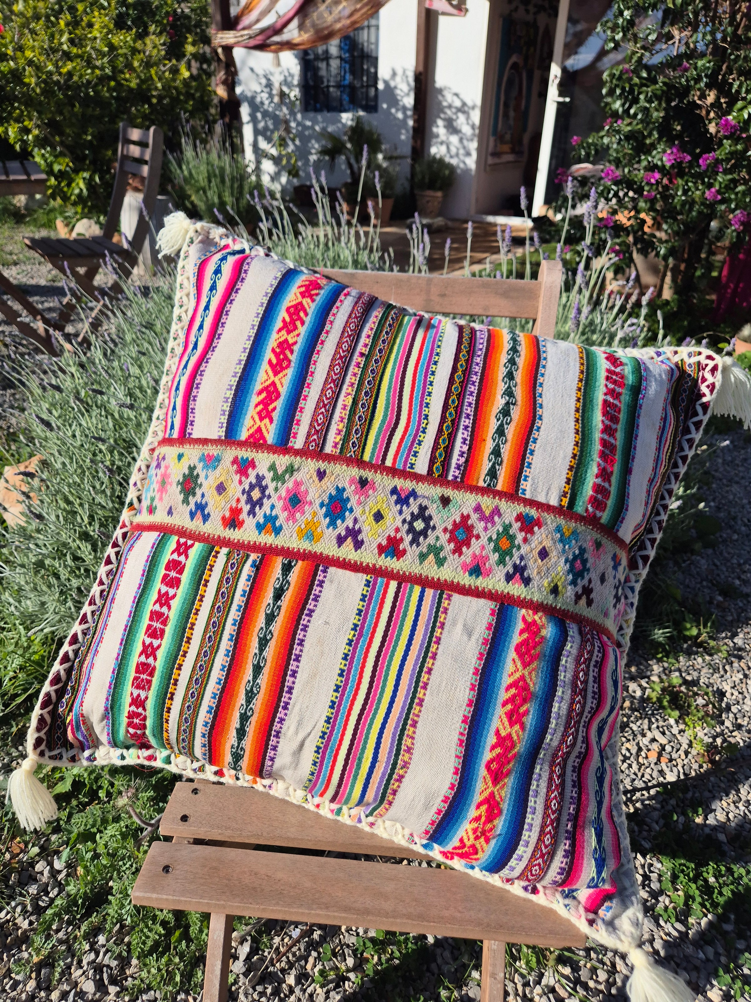 Beautiful handmade cushion cover made of vintage fabrics out of the Peruvian Andes. These vintage fabrics are also known as Aguayo fabrics. A fabric which is handwoven and handmade of natural dyed wool of sheep, lamas or alpacas.