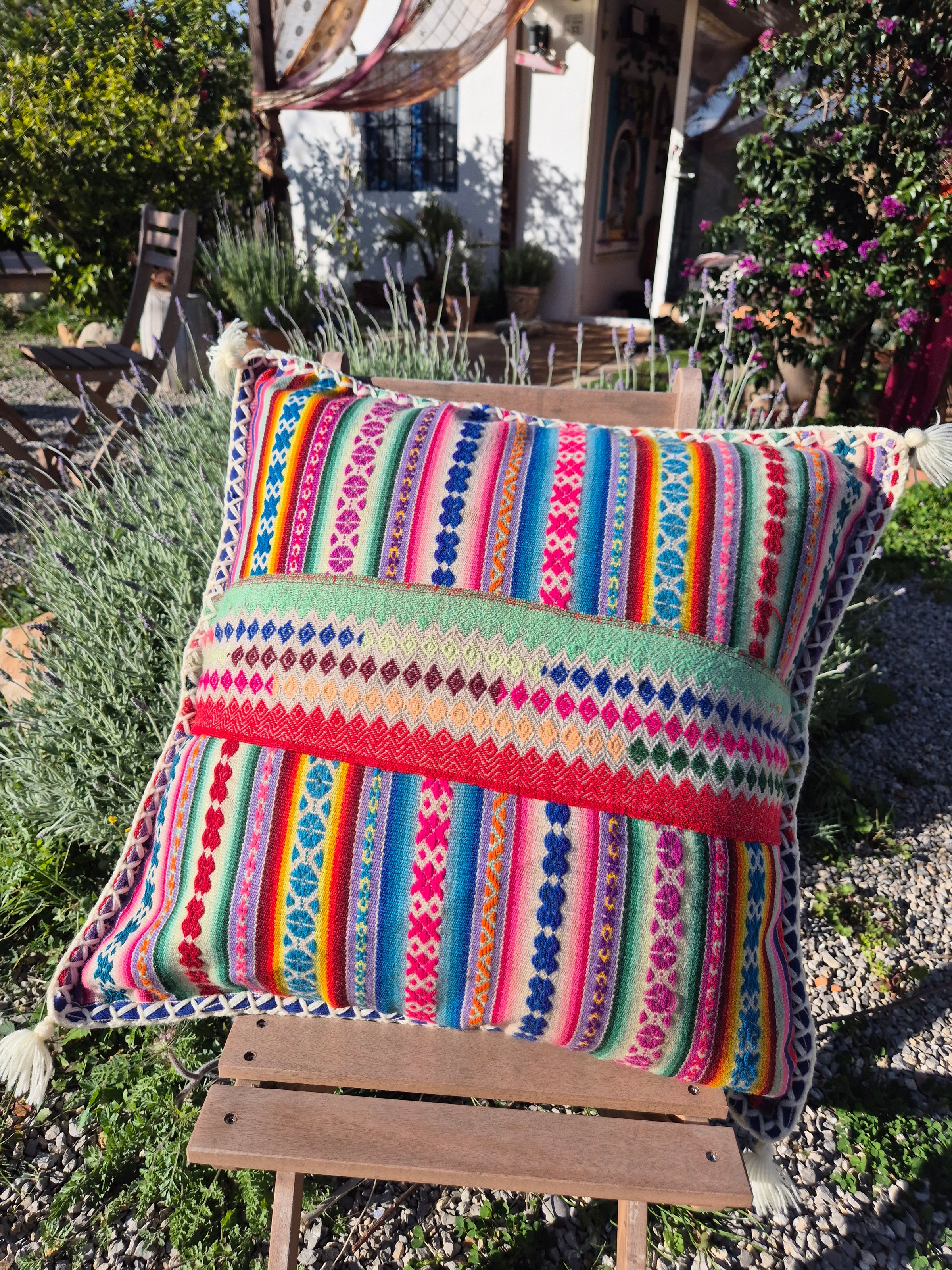 Beautiful handmade cushion cover made of vintage fabrics out of the Peruvian Andes. These vintage fabrics are also known as Aguayo fabrics. A fabric which is handwoven and handmade of natural dyed wool of sheep, lamas or alpacas.